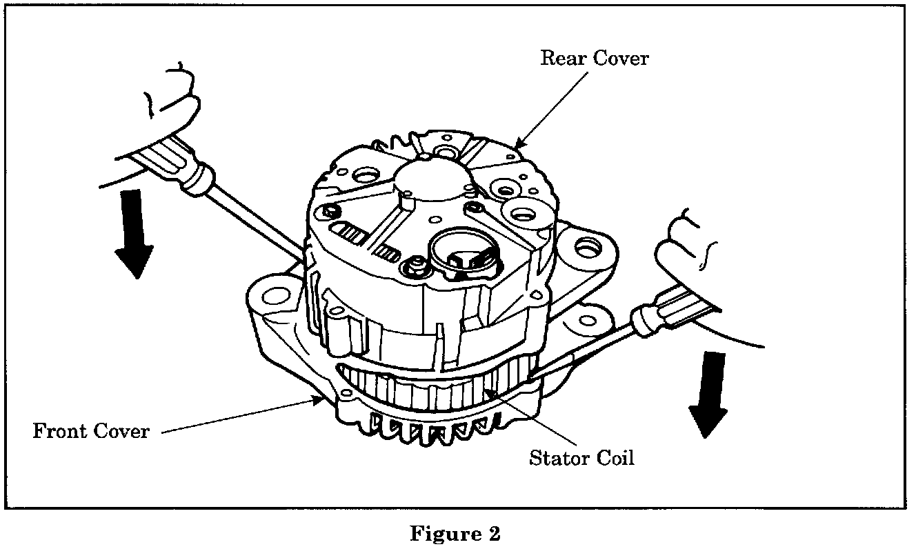 4. Separate the front and rear cover halves by inserting the tips of two screwdrivers into the gap between the front cover and the stator coil and prying the two covers apart at the same time (Figure 2).