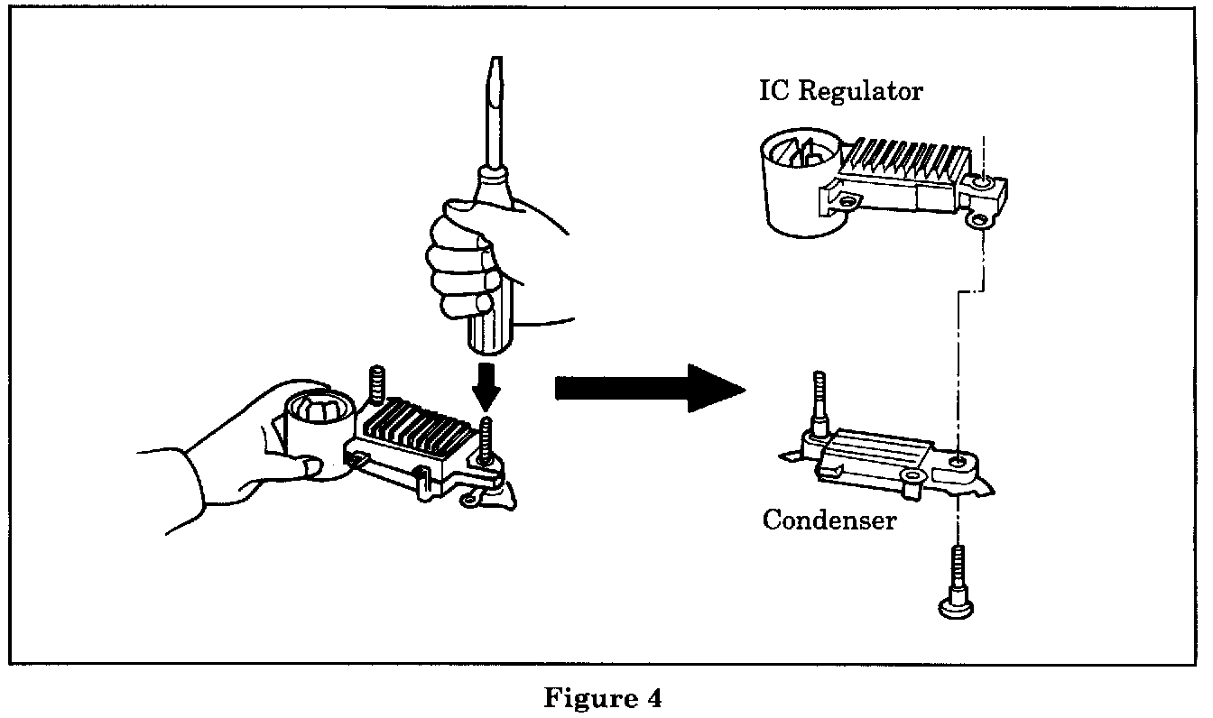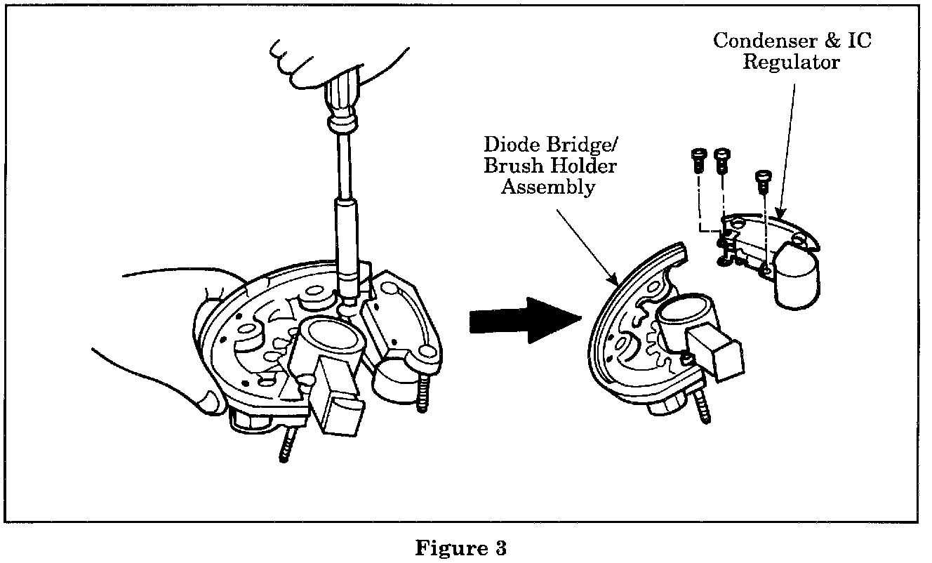 1. Remove the three M4 flange bolts holding the IC regulator and condenser to the diode bridge/brush holder assembly. Separate the IC regulator and condenser from the assembly (Figure 3).
