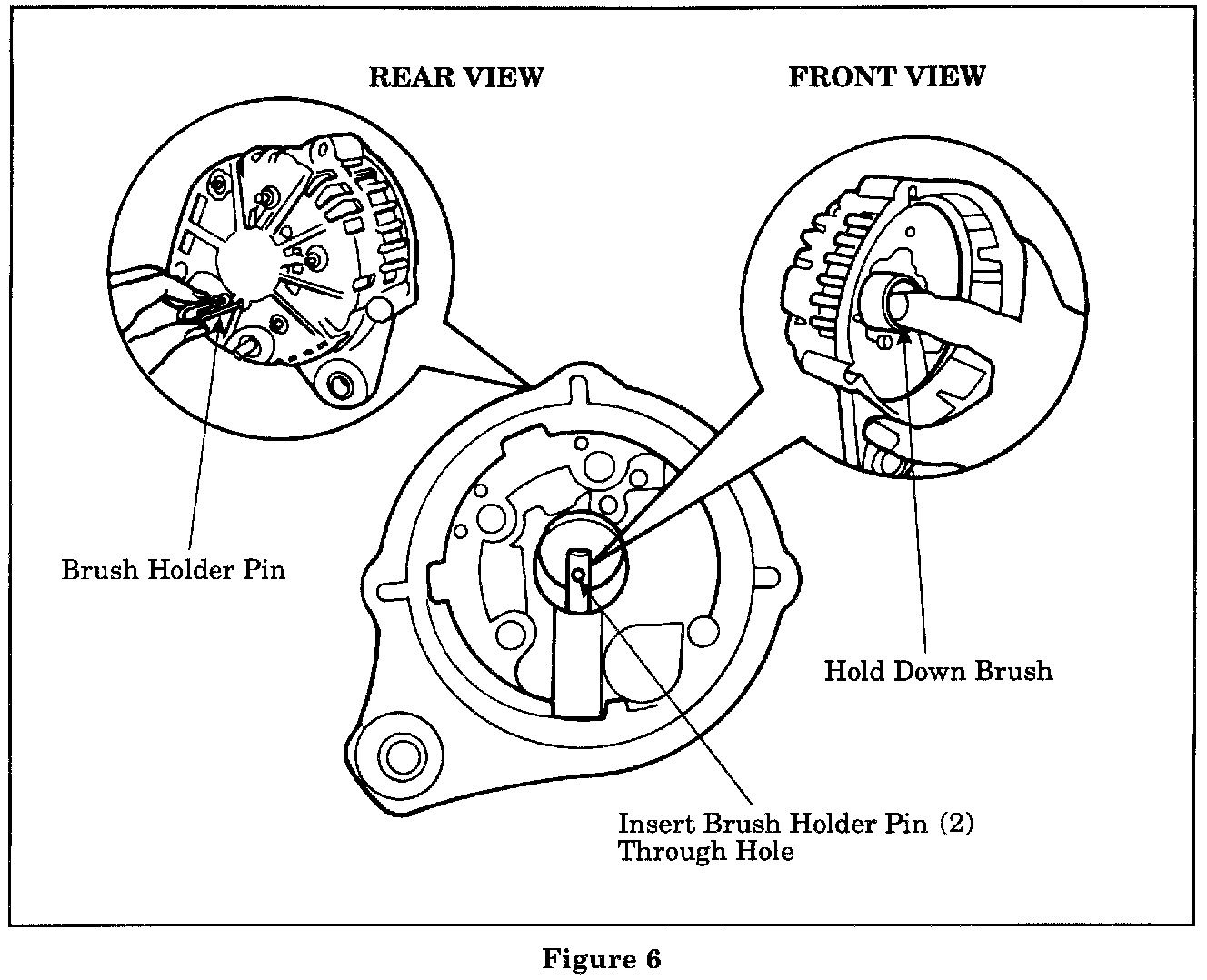 5. Using your finger, push the two brushes into the brush holder assembly at the same time until the brushes are flush against the assembly opening. While holding the two brushes firmly in place, insert the brush holder pin into the special opening on the rear cover and push down on the pin until the pin engages the holes in the two brushes (Figure 6).