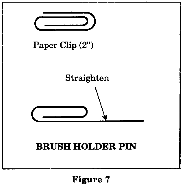 When properly engaged, the brush holder pin prevents the brushes from interfering with the rotor assembly slip rings during reassembly of the front and rear cover halves. The brush holder pin can be made from an ordinary 2-inch paper clip that is bent as shown in Figure 7.