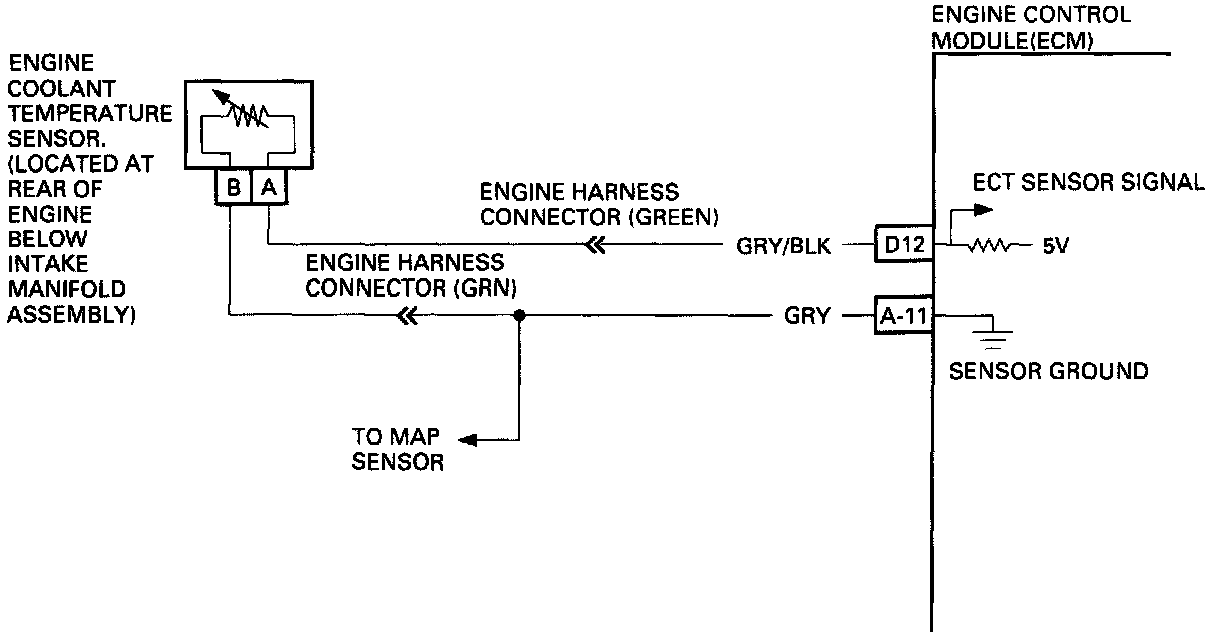 The Engine Coolant Temperature Sensor uses a Thermistor to control the signal voltage to the Engine Control Module (ECM). The ECM applies a reference voltage on GRY/BLK wire to the Sensor. When the Engine is cold, the Sensor (Thermistor) resistance is high. The ECM will then sense a high signal voltage.
