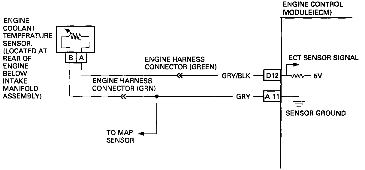 The Engine Coolant Temperature Sensor uses a Thermistor to control the signal voltage to the Engine Control Module (ECM). The ECM applies a reference voltage on GRY/BLK wire to the Sensor. When the Engine is cold, the Sensor (Thermistor) resistance is high. The ECM will then sense a high Engine Coolant Temperature (ECT) Sensor signal voltage.