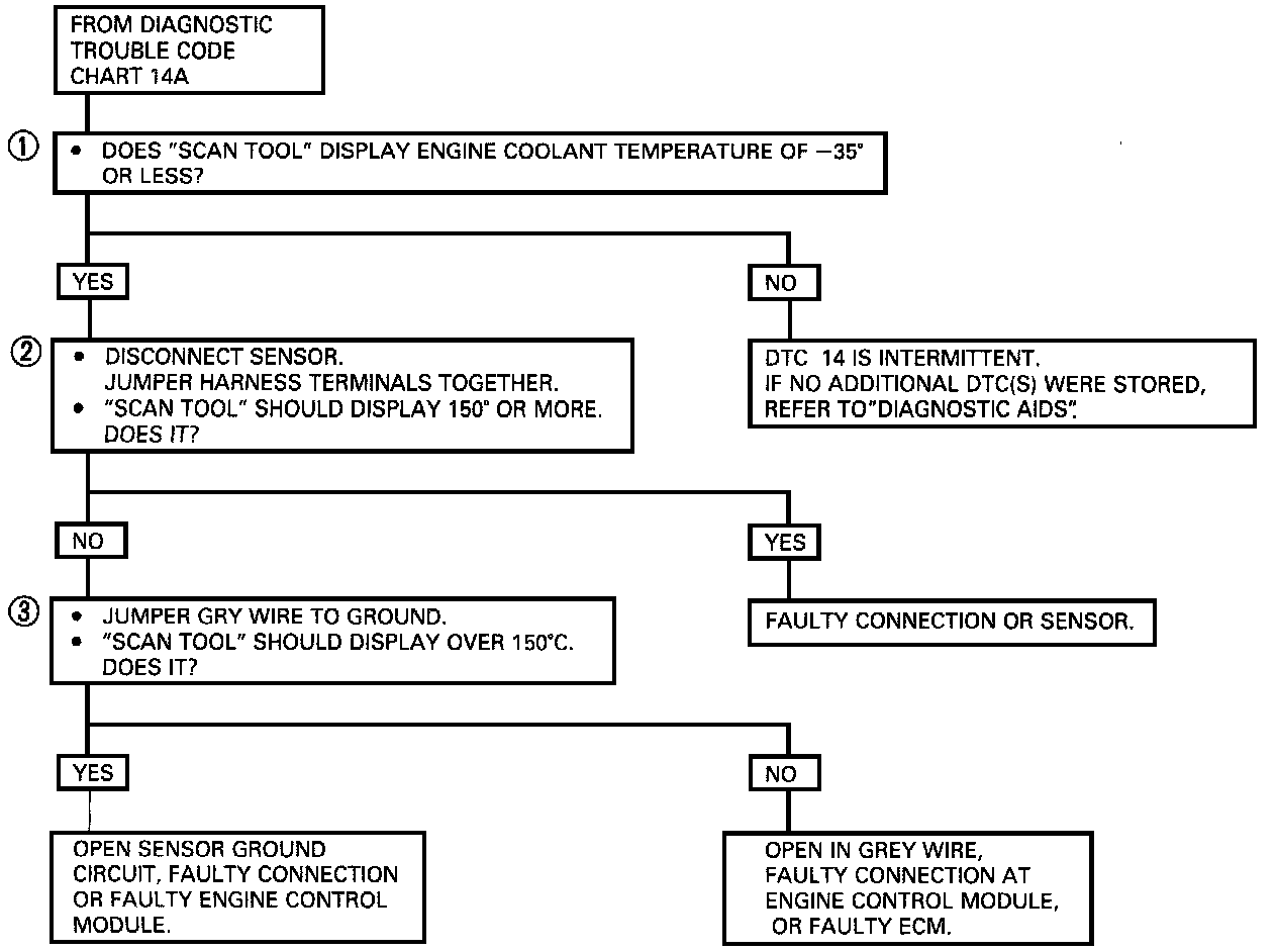 2. This test simulates conditions for DTC 14A. If the ECM recognizes the grounded circuit (low voltage), and displays a high temperature, the ECM and wiring are OK.