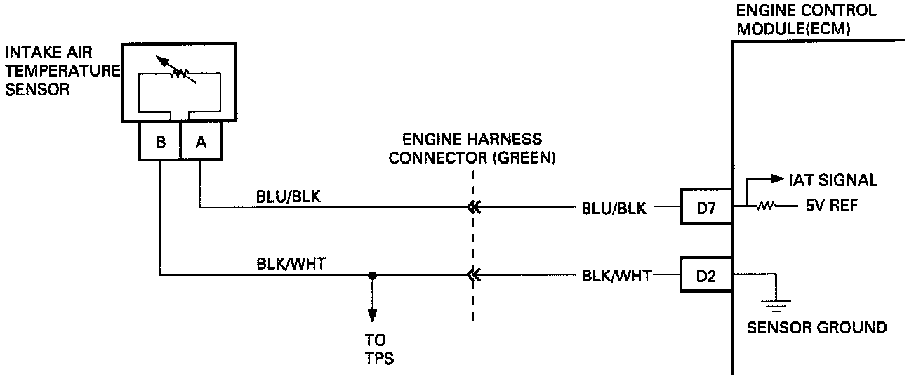 The Intake Air Temperature (IAT) Sensor uses a Thermistor to control the signal voltage to the Engine Control Module (ECM). The ECM applies a voltage (4-6 volts) to BLU/BLK wire of the Sensor. When Manifold air is cold, the Sensor (Thermistor) resistance is high, therefore, the ECM will see a IAT signal. As the air warms, the Sensor resistance becomes less and the IAT signal drops.