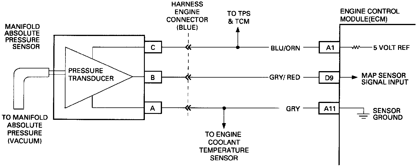 The Manifold Absolute Pressure (MAP) Sensor responds to changes in Manifold Pressure (vacuum). The Engine Control Module (ECM) receives this information as a signal voltage that will vary from about 0.45 to 0.85 volts, at closed Throttle idle, to 3.8 - 4.5 volts at Wide Open Throttle (low vacuum). If the MAP Sensor fails, the ECM will substitute a fixed MAP value based on Throttle Position Sensor to control Fuel delivery.