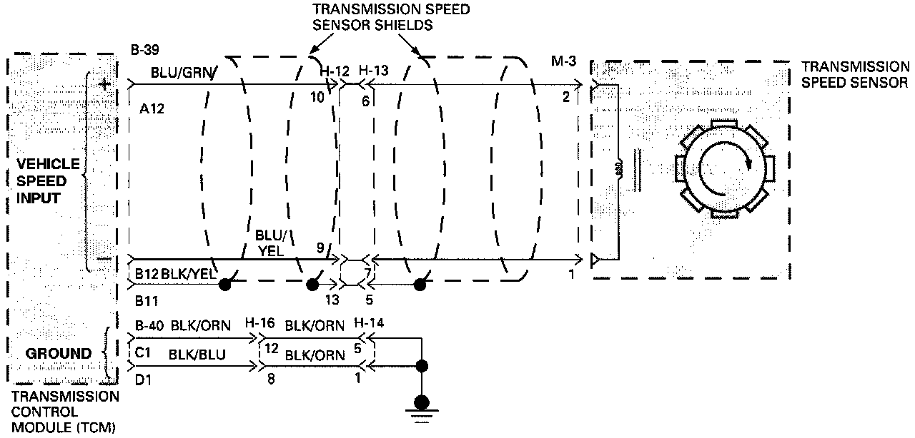 The Transmission Output Speed Sensor provides information on Vehicle speed to the Transmission Control Module (TCM). The Speed Sensor Circuit consists of a magnetic induction type Sensor. The Sensor is mounted above a target wheel pressed on the output shaft in the Transmission extension. As the output shaft turns, the target wheel teeth induce a variable voltage in the magnetic pickup. This alternating current (AC) signal is provided to the TCM. The voltage increases with the speed of the wheel but this is not used to define the speed of the Vehicle. As the Vehicle moves faster, the signal alternates faster between positive and negative voltages. The output speed information is proportional to the frequency of the signal.