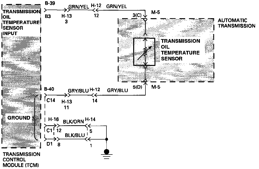 - The Transmission Oil Temperature Sensor is a Thermistor within the internal wiring harness of the Transmission in the adaptor case Oil Pan. The Transmission Control Module (TCM) applies 5 volts to the Sensor Connector M5 Terminal 3C. The other side of the Sensor is connected to ground through the TCM Terminal C14. When the Transmission Oil is cold, the Sensor resistance is high and the TCM will sense high signal voltage.