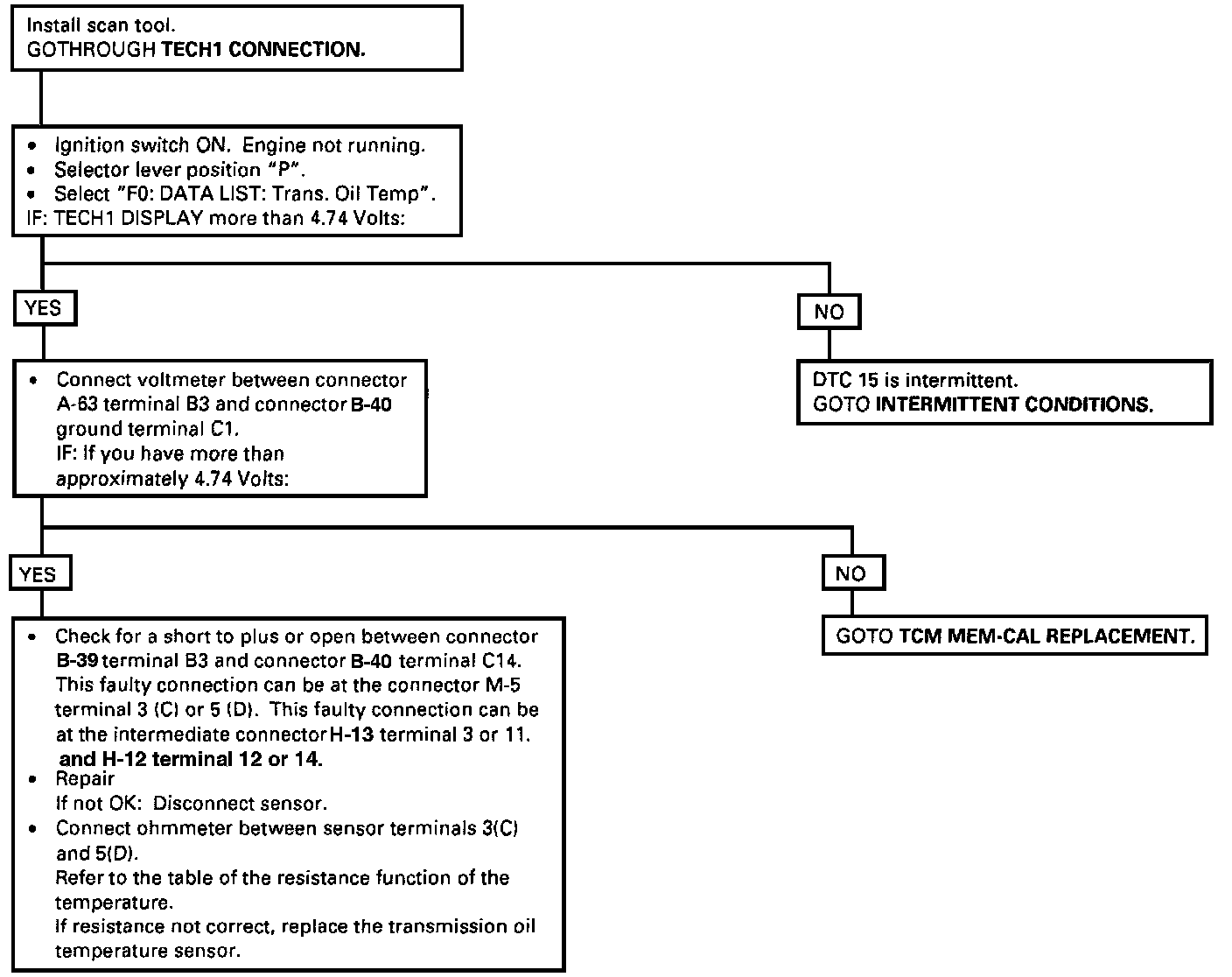 - When DTC 15 is set, the Transmission will use a warm value for operation, but the Scan Tool will display the actual Oil temperature.