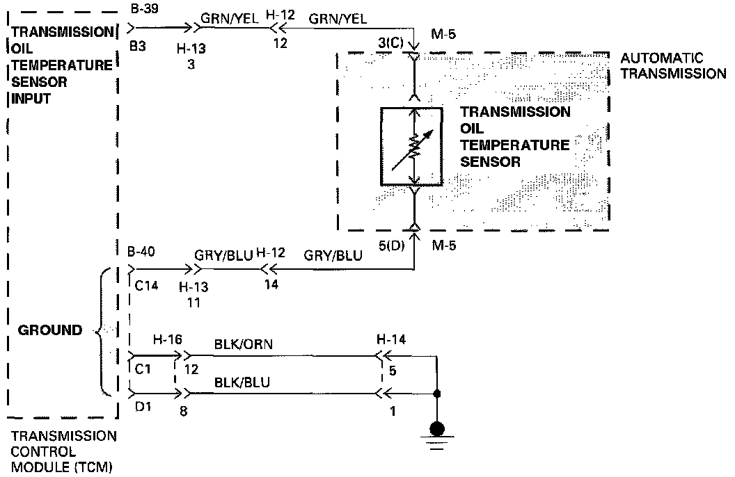 - The Transmission Oil Temperature Sensor is a Thermistor within the internal wiring harness of the Transmission in the adaptor case Oil Pan. The Transmission Control Module (TCM) applies 5 volts to the Sensor Connector M5 Terminal 3C. The other side of the Sensor is connected to ground through the TCM Terminal C14. When the Transmission Oil is cold, the Sensor resistance is high and the TCM will sense high signal voltage.
