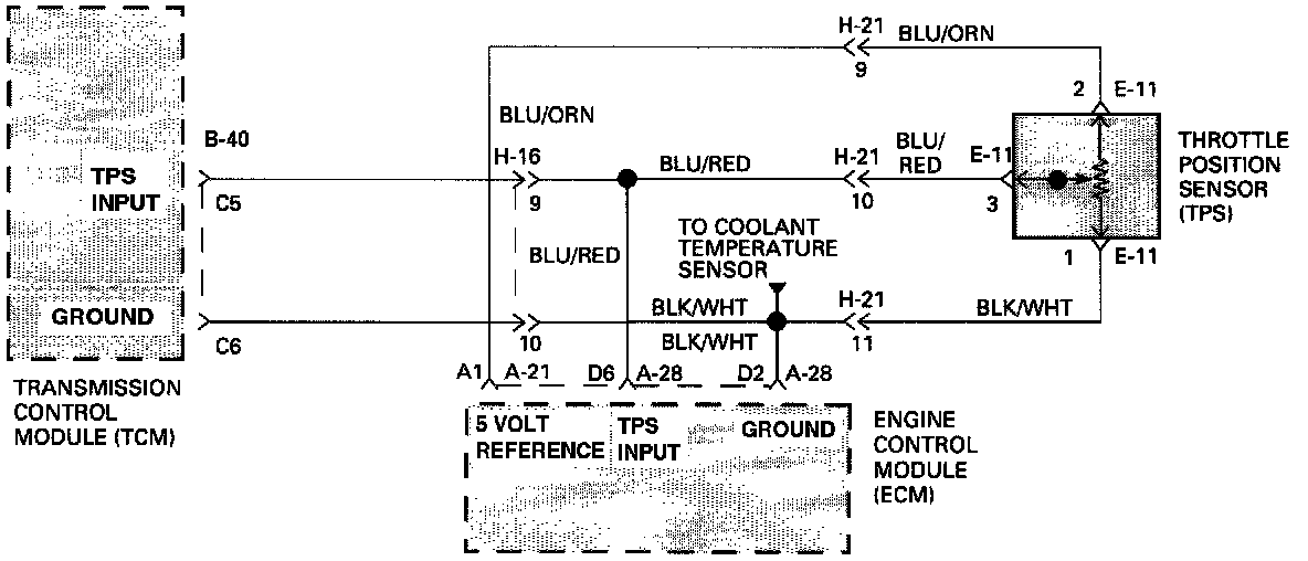 - The Engine Control Module (ECM) also receives this signal. This TPS is a variable resistance with one side (Connector E-11 Terminal 2) connected only to the ECM Connector to have the 5.0 volts supply voltage. The other side (Connector E-11 Terminal 1) is connected to the Transmission Control Module (TCM) (floating ground) and the ECM (ground). The "middle" (the wiper) (Connector E-11 Terminal 3) is connected to the TCM and the ECM.