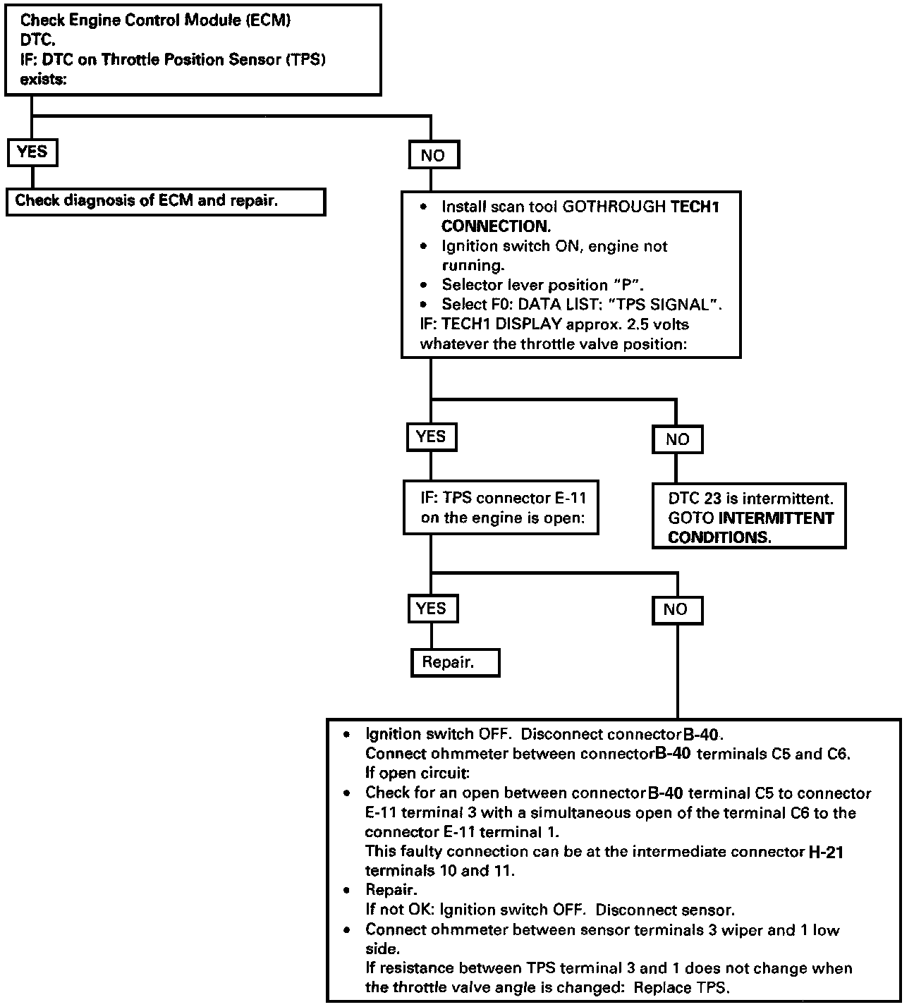 - The Throttle Position Sensor (TPS) provides a voltage signal that changes relative to the Throttle Plate position. Signal voltage between Connector B-40 Terminals C5 and C6 will vary from about 0.4 at idle to about 4.6 volts at Wide Open Throttle.
