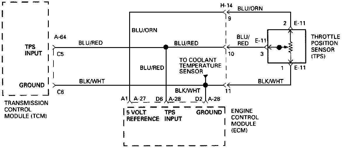 - The Engine Control Module (ECM) also receives this signal. This TPS is a variable resistance with one side (Connector E-11 Terminal 2) connected only to the ECM Connector to have the 5.0 volts supply voltage. The other side (Connector E-11 Terminal 1) is connected to the Transmission Control Module (TCM) (floating ground) and the ECM (ground). The "middle" (the wiper) (Connector E-11 Terminal 3) is connected to the TCM and the ECM.