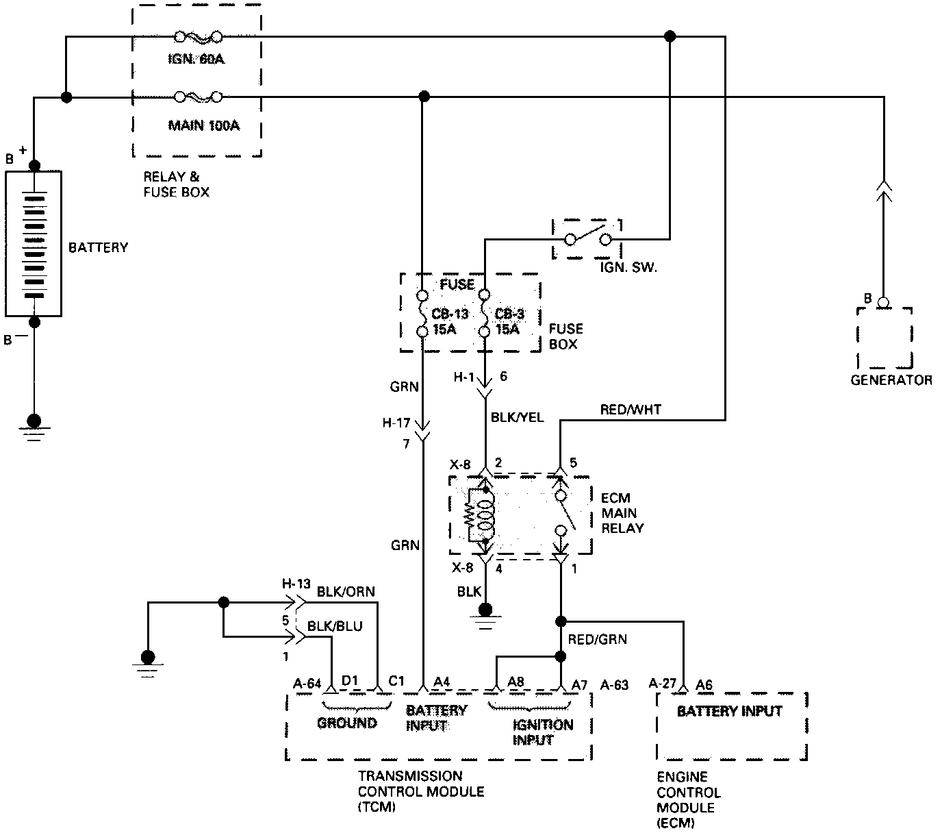 a. Ignition voltage measured between TCM Terminal A7 or AB and ground C1 is lower than specification. Specification decreases with the Transmission Oil temperature.