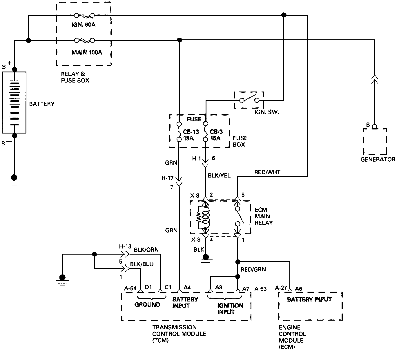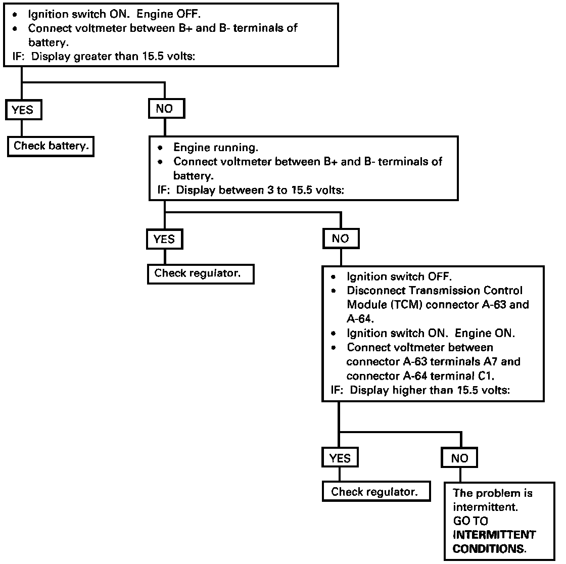 a. Ignition voltage measured between TCM Terminal A7 or A8 and ground C1 is higher than 15.5 volts.