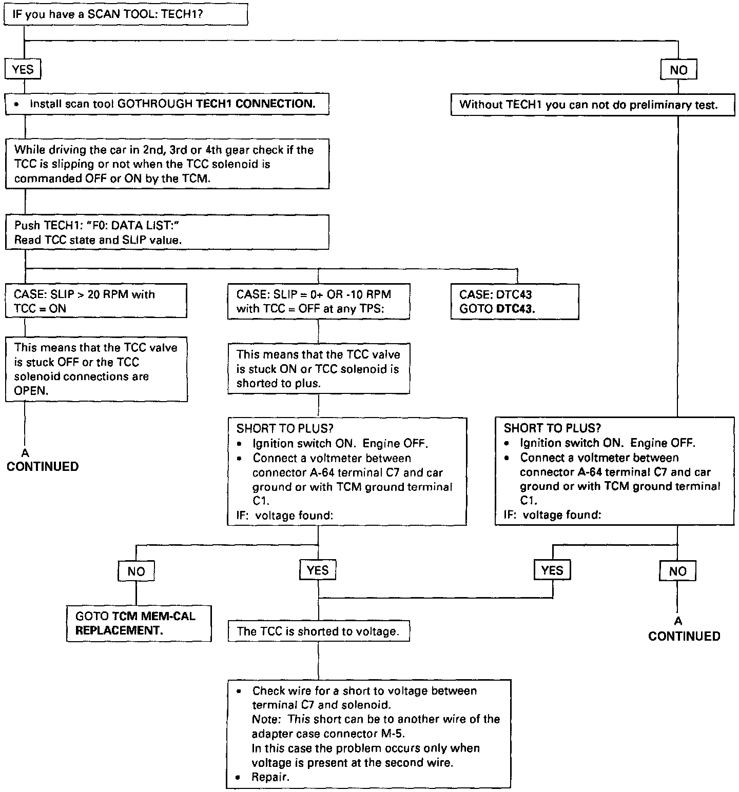 - If this circuit is shorted to plus, the TCC Solenoid is constantly commanded "ON" (shifts can be firm). In First Gear the TCC is hydraulically "OFF", whatever the TCC Solenoid position. This means that the car can be driven even with the TCC shorted to voltage. The Engine could stall when the driver is braking strongly, if the car is stopped when the Transmission is still in second Gear with TCC applied.