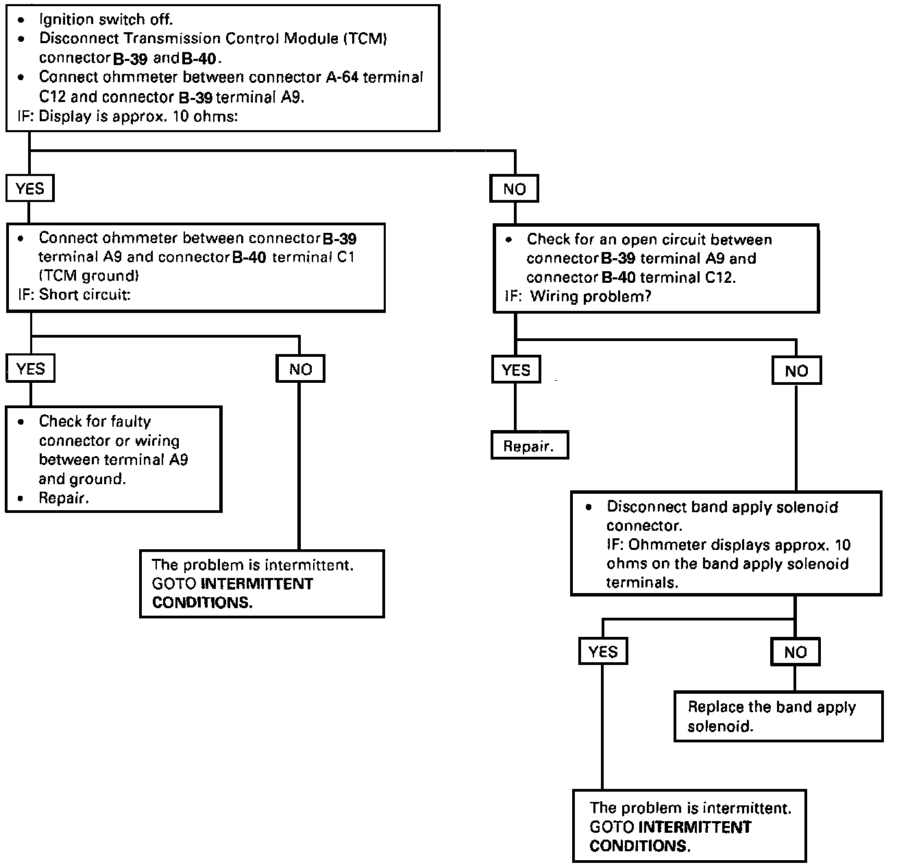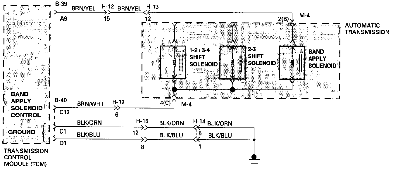 - When the Ignition is turned "ON", and before the Engine is cranked, the TCM activates the shift Solenoids (1-2/3-4, 2-3 and Band) to check for short circuits or open circuits. To do so the Gear is set to 4th, 3rd, 1st, 1st with band apply, 4th with no HSD. Each one of the 5 tests requires 0.15 seconds. If the Engine is cranked before the end of all tests, the remaining tests are not done.