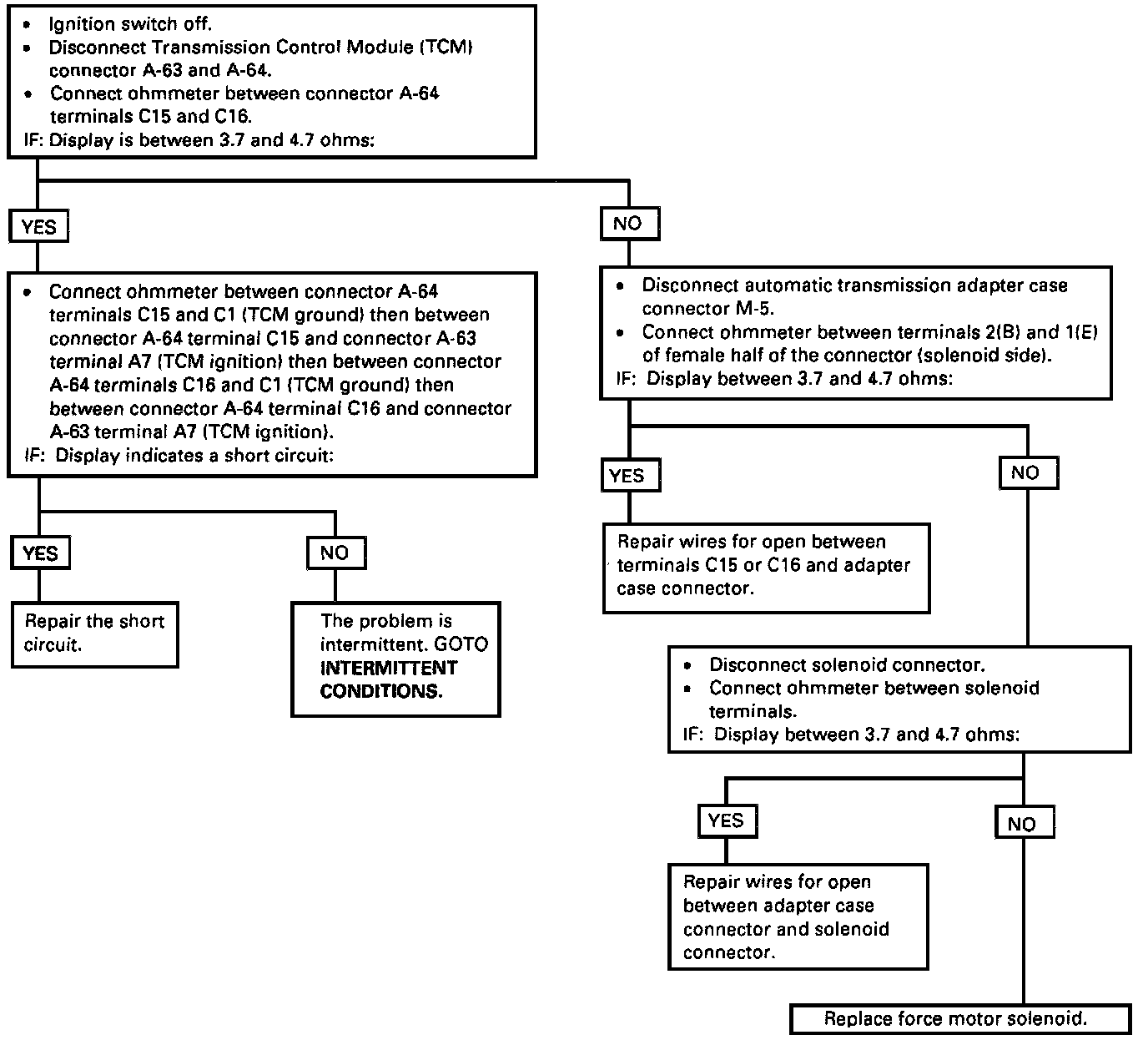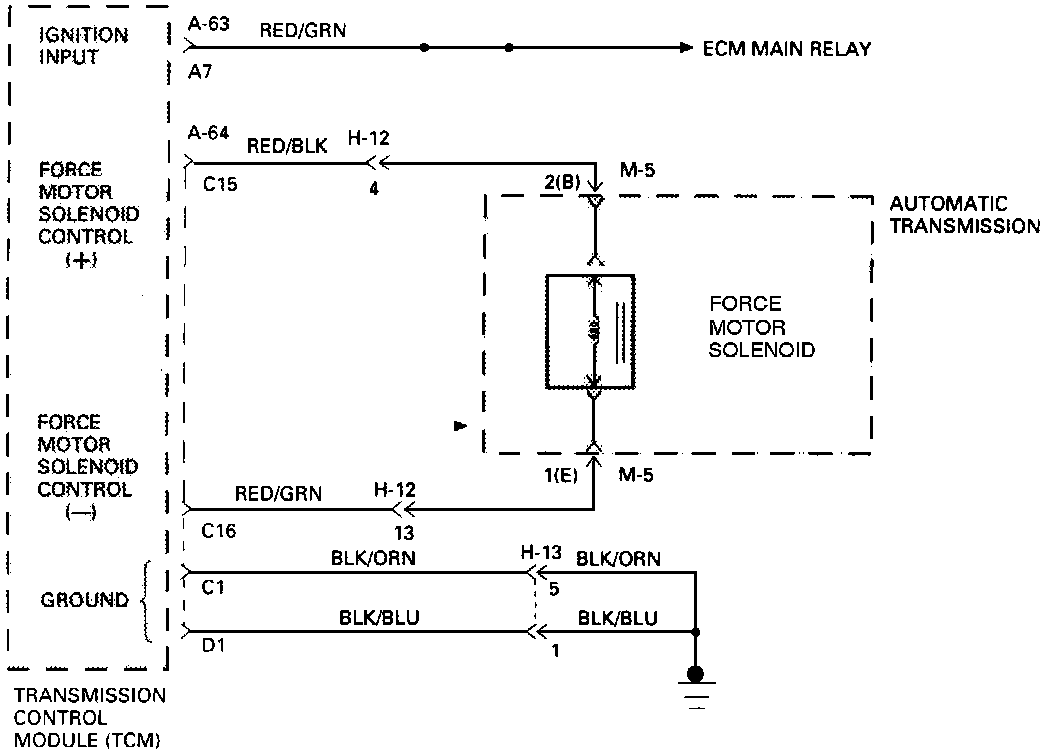 - The Force Motor Solenoid is a device used to regulate Transmission line pressure. The Transmission Control Module (TCM) uses Throttle Position Sensor (TPS) information and Vehicle speed information to determine the line pressure appropriate for a given load. The TCM will regulate the pressure by applying a varying amperage to the force motor Solenoid. The applied amperage can vary from 0.1 to 1.1 amp. The TCM then monitors the amperage at the return line. If the return amperage is more than 0.2 amp from the commanded amperage, the DTC is stored.