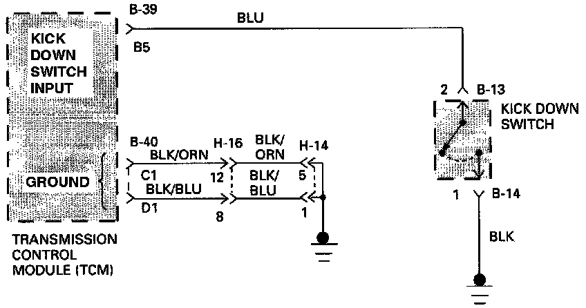 - When the driver presses the Accelerator Pedal down fully, the Kick Down Switch closes, sending a ground signal to the Transmission Control Module (TCM).