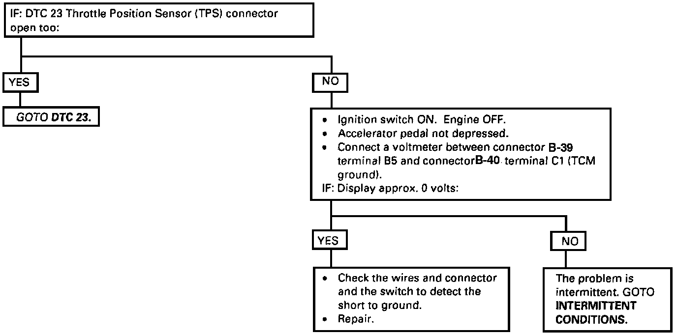 b. No malfunction: TPS short to voltage or ground (DTC 21 and DTC 22).
