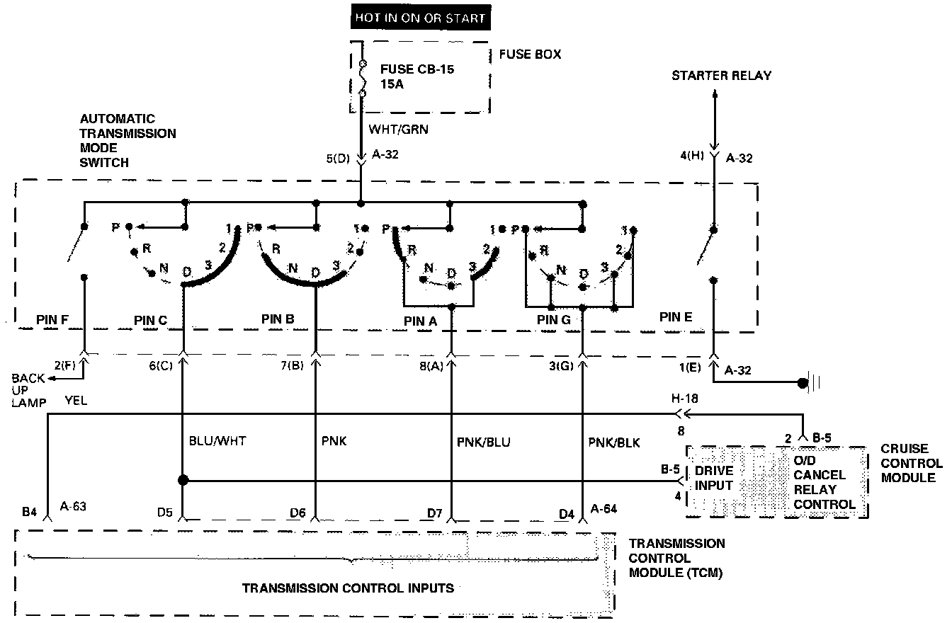- The Mode Switch is also used to provide the information P or N to the Engine crank wiring. The Engine can be cranked only if connector A-32 terminal 4-H is connected to terminal 1-E, which is connected to ground.
