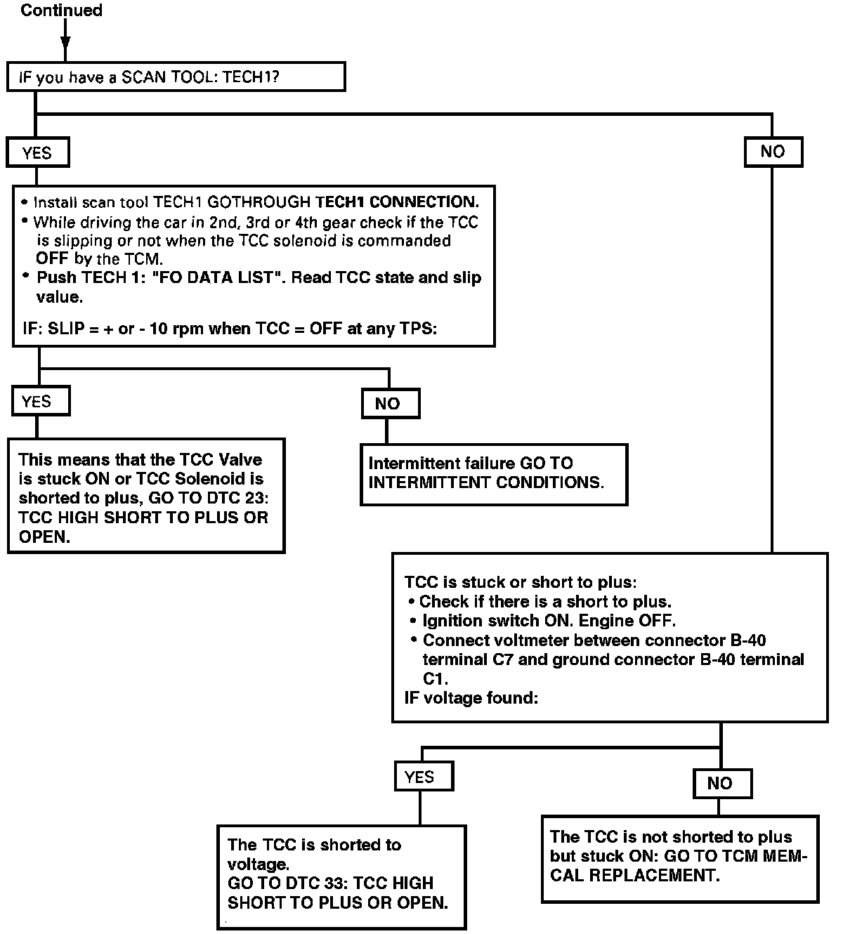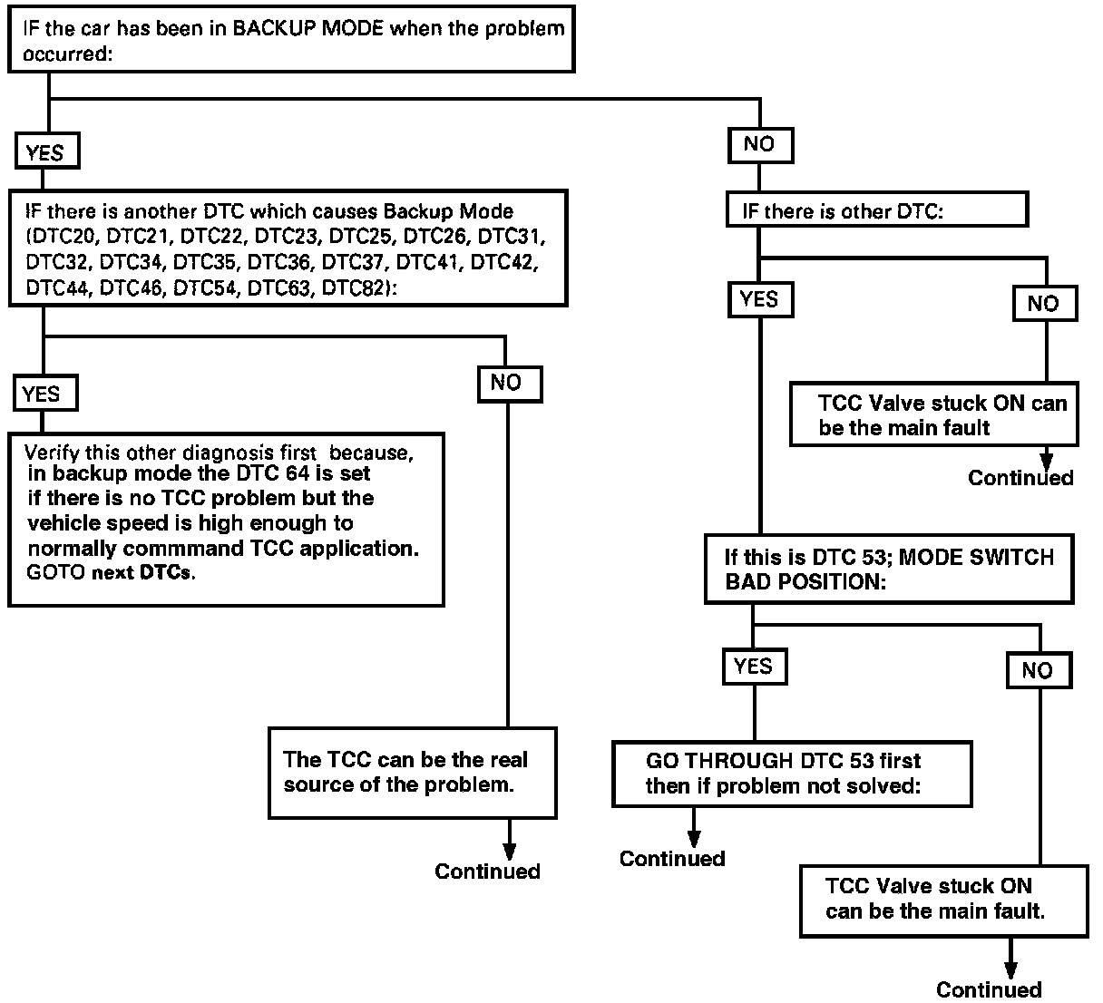 NOTE: When the TCC is constantly turned "ON" electrically (short circuit), the hydraulic circuit does not apply the TCC in first gear, so the Engine does not stall. However, if the driver brakes sharply in 2nd gear, Engine may stall.