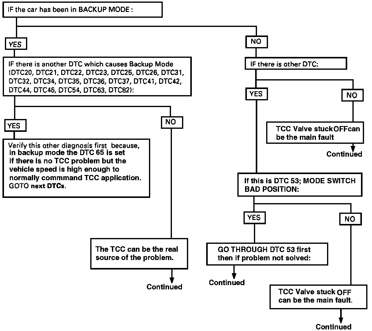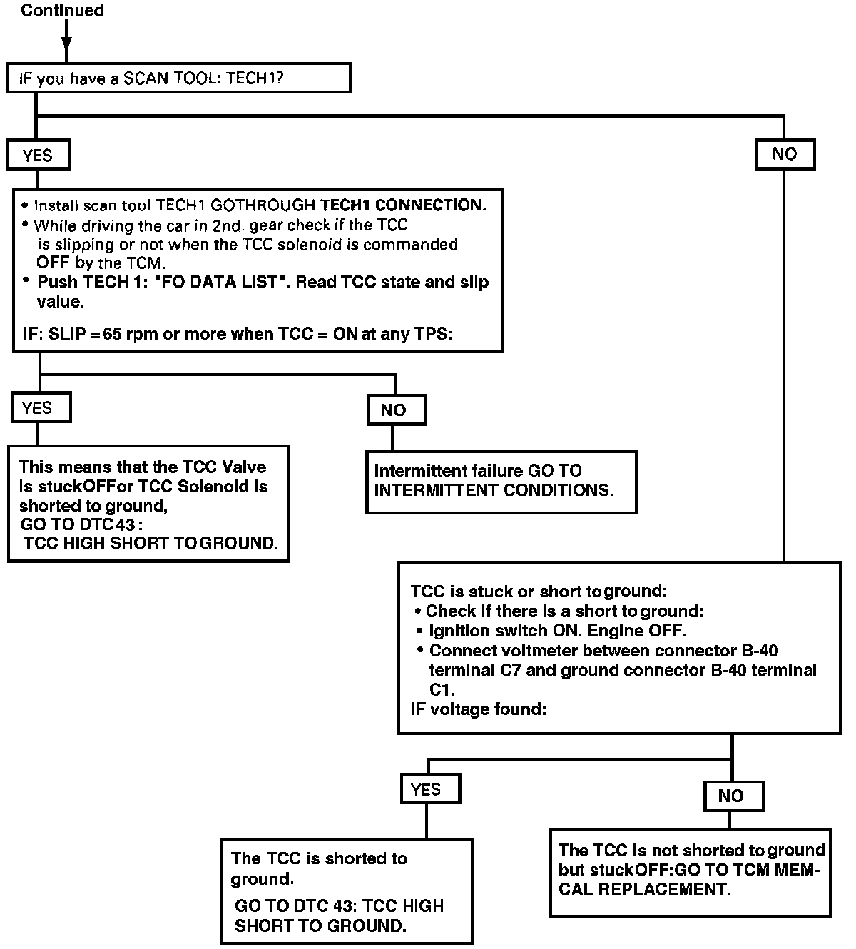 NOTE: When the TCC is constantly turned "ON" electrically (short circuit), the hydraulic circuit does not apply the TCC in first gear, so the Engine does not stall. However, if the driver brakes sharply in 2nd gear, Engine may stall.
