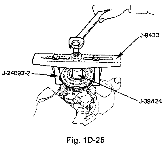 - Using pulley puller pilot (J-38424), pulley puller (J-8433) and pulley puller leg (J24092) to remove the pulley assembly.
