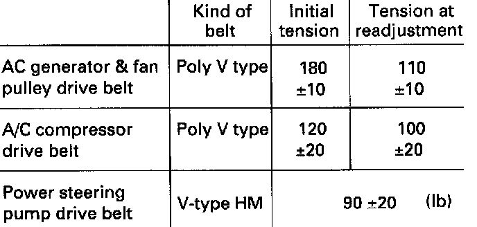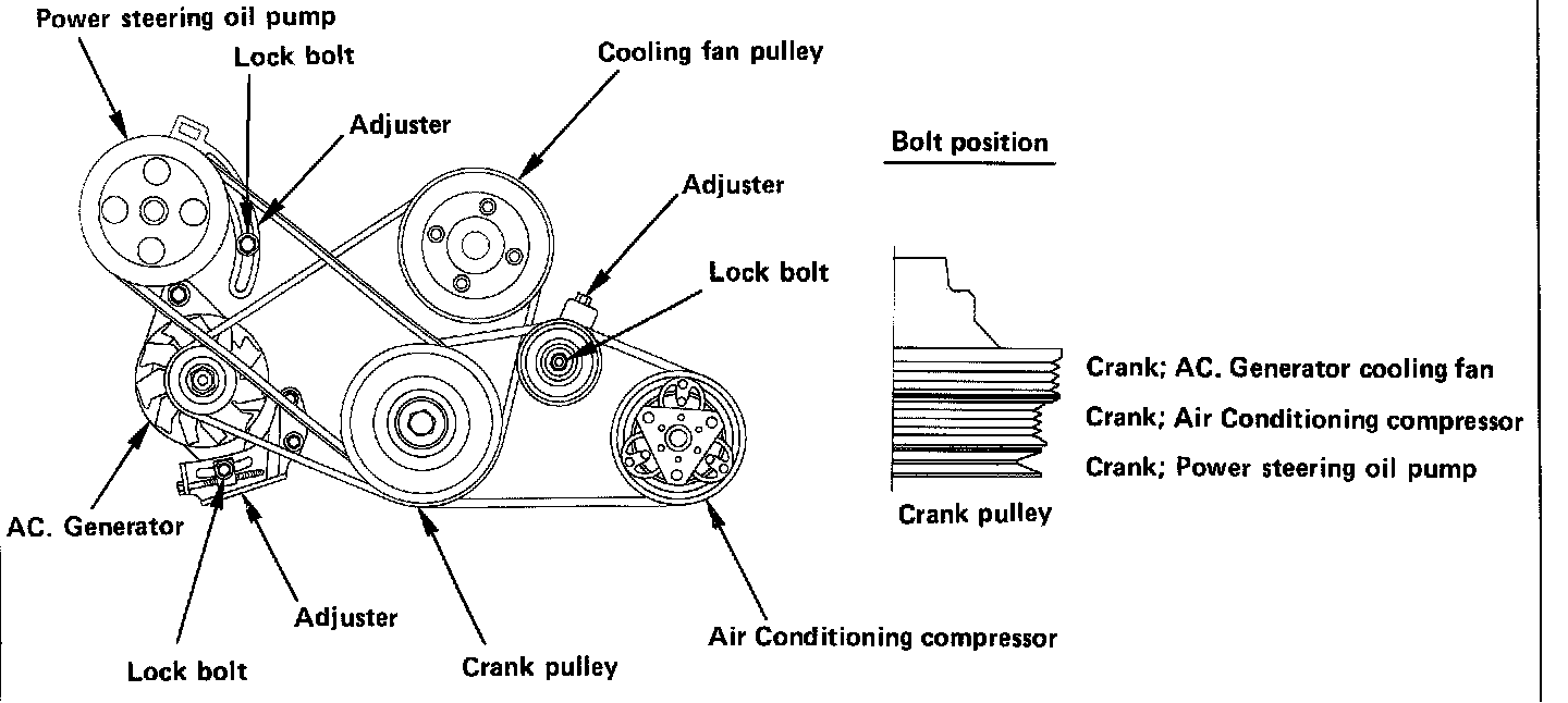Generator & fan pulley drive belt Loosen generator fixing bolt and adjuster lock bolt. Adjust bolt by turning adjust bolt. After installation, tighten lock bolt to the specified tightening torque.