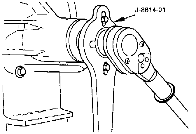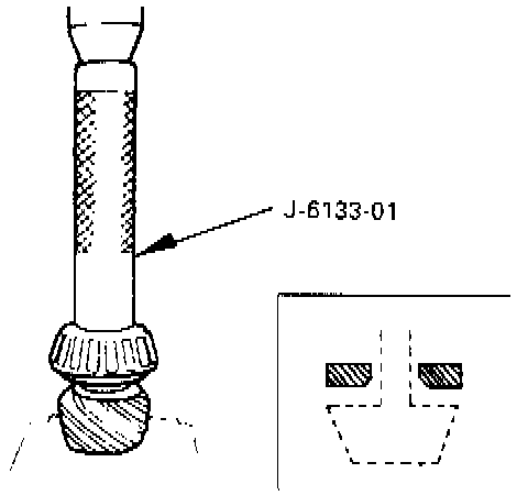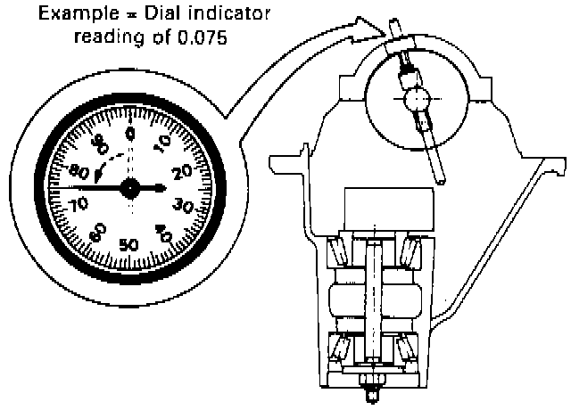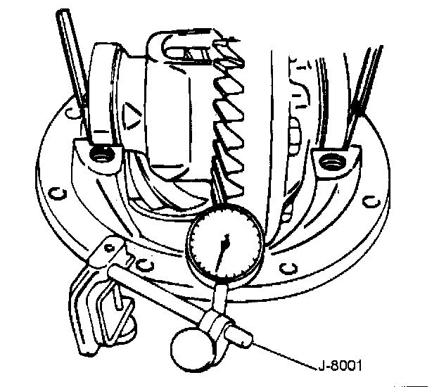 (c) Using two sets of feeler gauges insert a feeler stock of sufficient thickness between each bearing outer race and the carrier to remove all end play. Make certain the feeler stock is pushed to the bottom of the bearing bores. Mount the dial indicator on the carrier so that the indicator stem is at right angles to a tooth on the ring gear. Dial indicator: J-8001