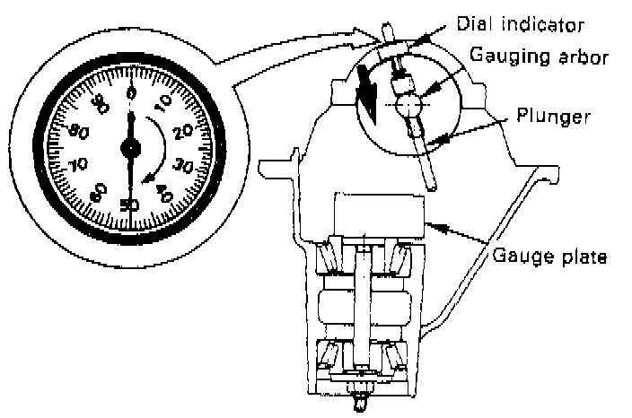 (d) Position the plunger on the gauge plate. Move the gauging arbor slowly back and forth and locate the position at which the dial indicator shows the greatest deflection. At this point, once again set the dial indicator to "0" Repeat the procedure to verify the "0" setting.