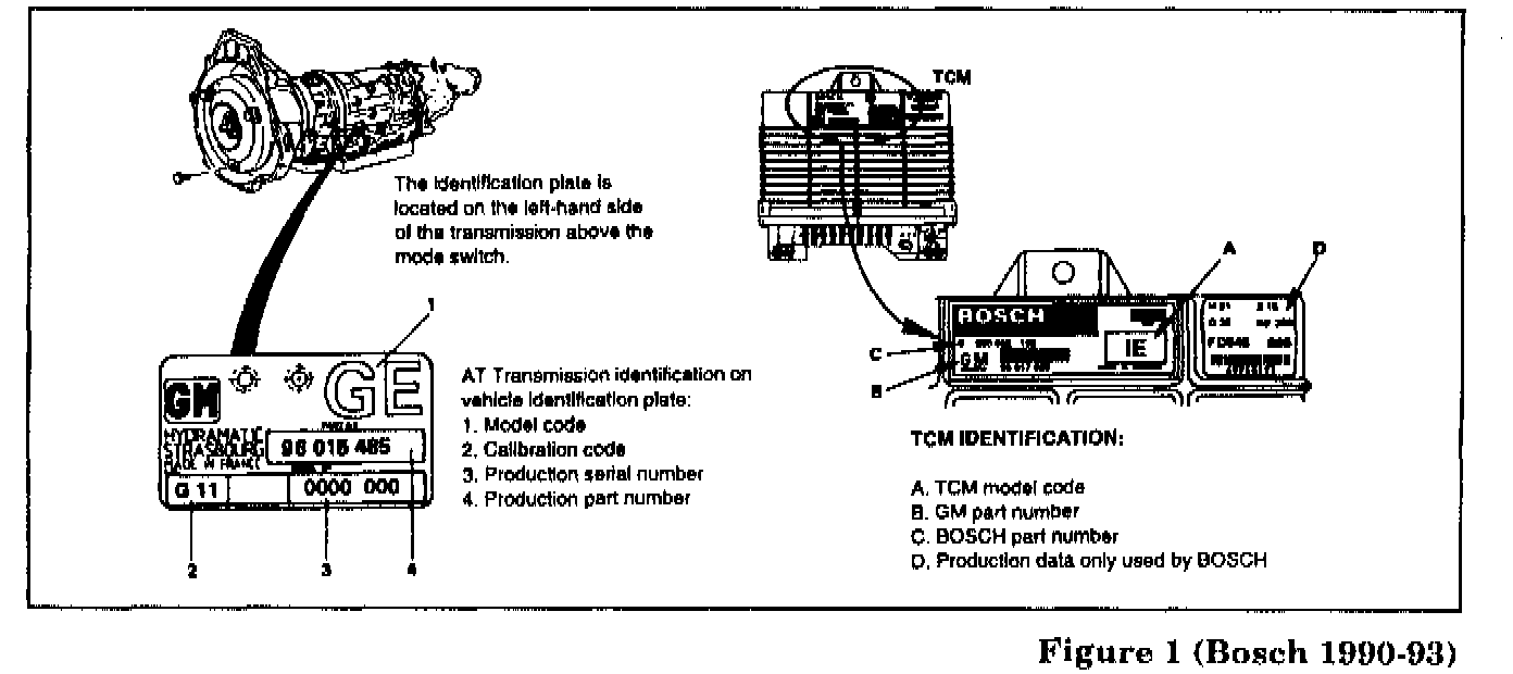 This Service Bulletin provides important identification data to ensure that a proper pairing of transmission and TCM is always made. Figures 1 through 3 show the typical location of the identification plate on both the transmission and TCM. Figure 1 shows the typical location on transmissions and TCMs manufactured by Bosch for 1990-93 MY vehicles. Figures 2 and 3 show the typical location on transmissions and TCMs manufactured by Delco Electronics for 1994 and 1995-95.5 MY vehicles respectively.