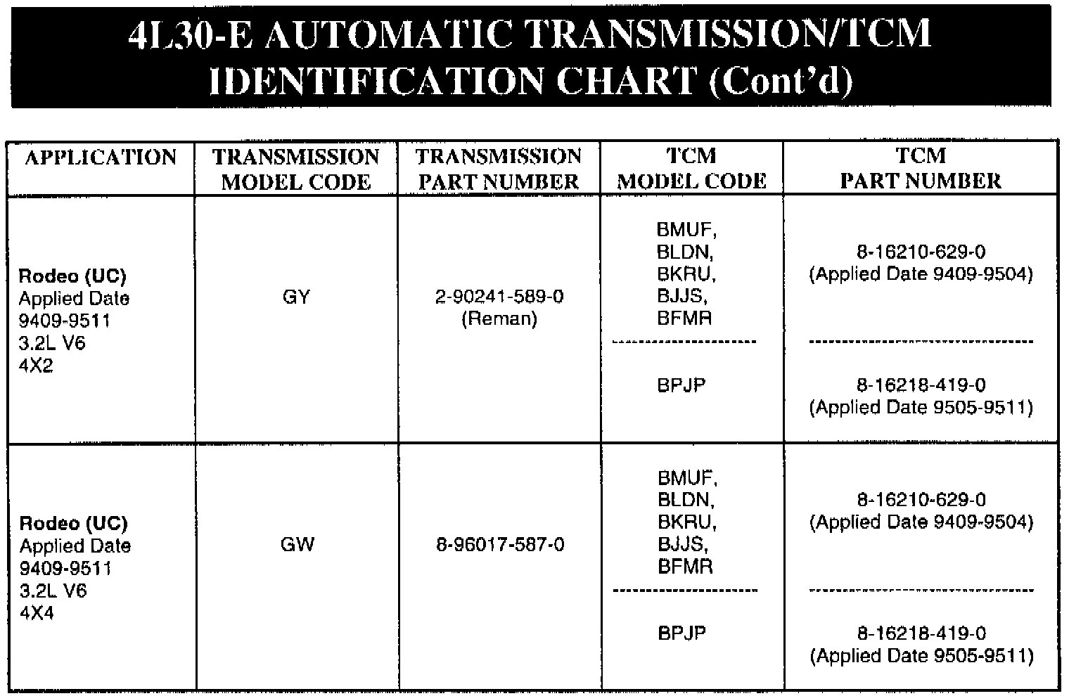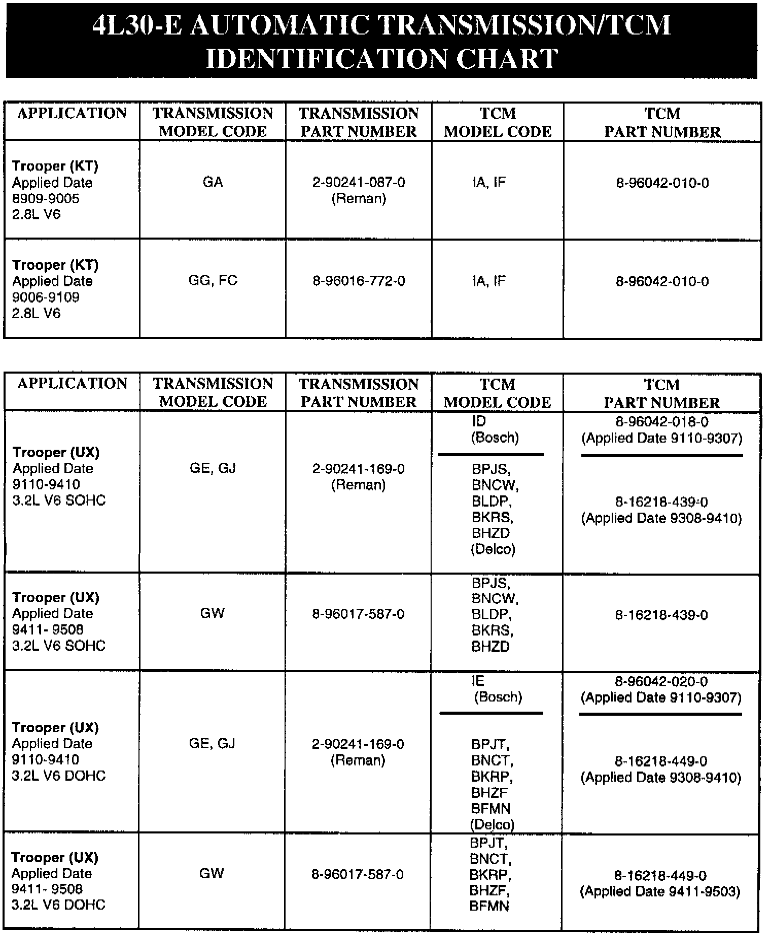 1990-91 Trooper II (KT), 1992-95 Trooper (UX), 1991-95.5 Rodeo (UC) models equipped with 4L30-E automatic transmission.