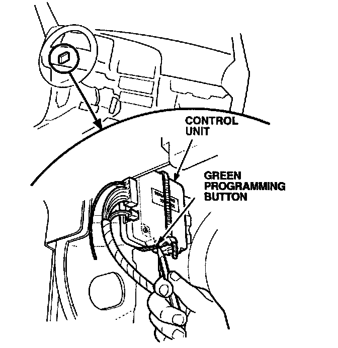 3. Press and hold the green programming button on the side of the control unit with a pen or pencil until the exterior lights come on. The lights will come on for five seconds. (Steps 3 and 4 must be done within 5 seconds of each other.)