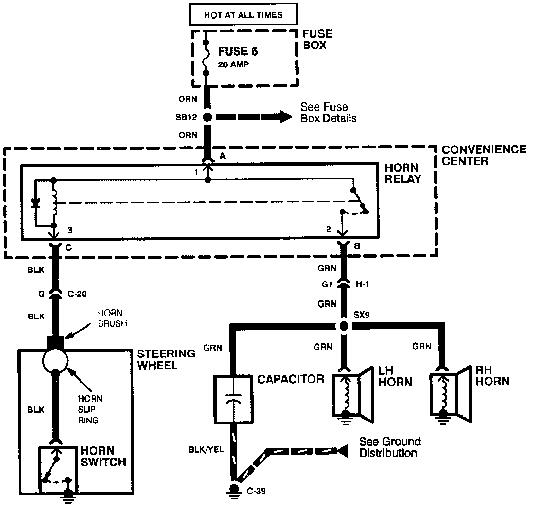 Voltage is applied to the Horn Relay at all times. When the relay coil is grounded by closing the Horn Switch, the relay contacts close. When the relay contacts are closed, both the LH and RH Horns are energized.