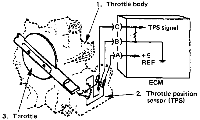 By monitoring the voltage on the signal line the ECM calculates throttle position. As the TB angle is changed (accelerator pedal moved), the output of TP sensor also changes. At a closed throttle position, the output of the TP sensor is low (approximately 0.5 volt). As the TB opens, the output increases so that, at wide-open throttle, the output voltage will be between 4 and 5 volts.