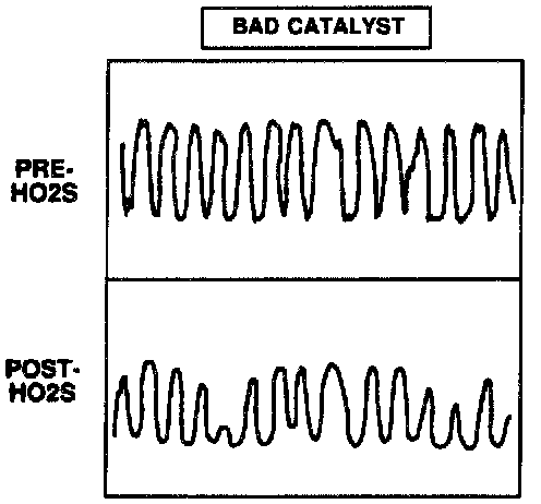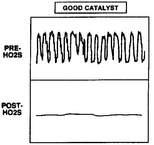 A good catalyst (e.g. 95% hydrocarbon conversion efficiency) will show a relatively flat output voltage on the post-catalyst Heated Oxygen Sensor (HO2S).