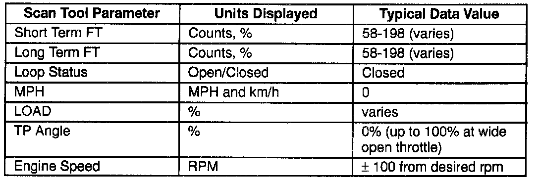 Long Term Fuel Trim (FT) is derived from the short term fuel trim value and is used for long term correction of fuel delivery. A value of 128 counts (0%) indicates that fuel delivery requires no compensation to maintain a 14.7:1 air/fuel ratio. A value below 128 counts means that the fuel system is too rich and fuel delivery is being reduced (decreased injector pulse width). A value above 128 counts indicates that a lean condition exists and the PCM is compensating.