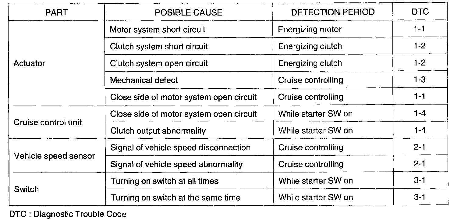 1. While starter switch on and vehicle speed is 0 kph, the DTC output begins in top priority by cancel switch turn on and oft being repeated three times for 2 sec. while cruise main switch pushing on and stops the DTC output whether vehicle speed is more than 10 kph or the resume switch is turned on.