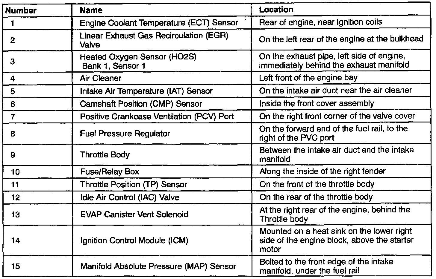 Engine Component Locator Table