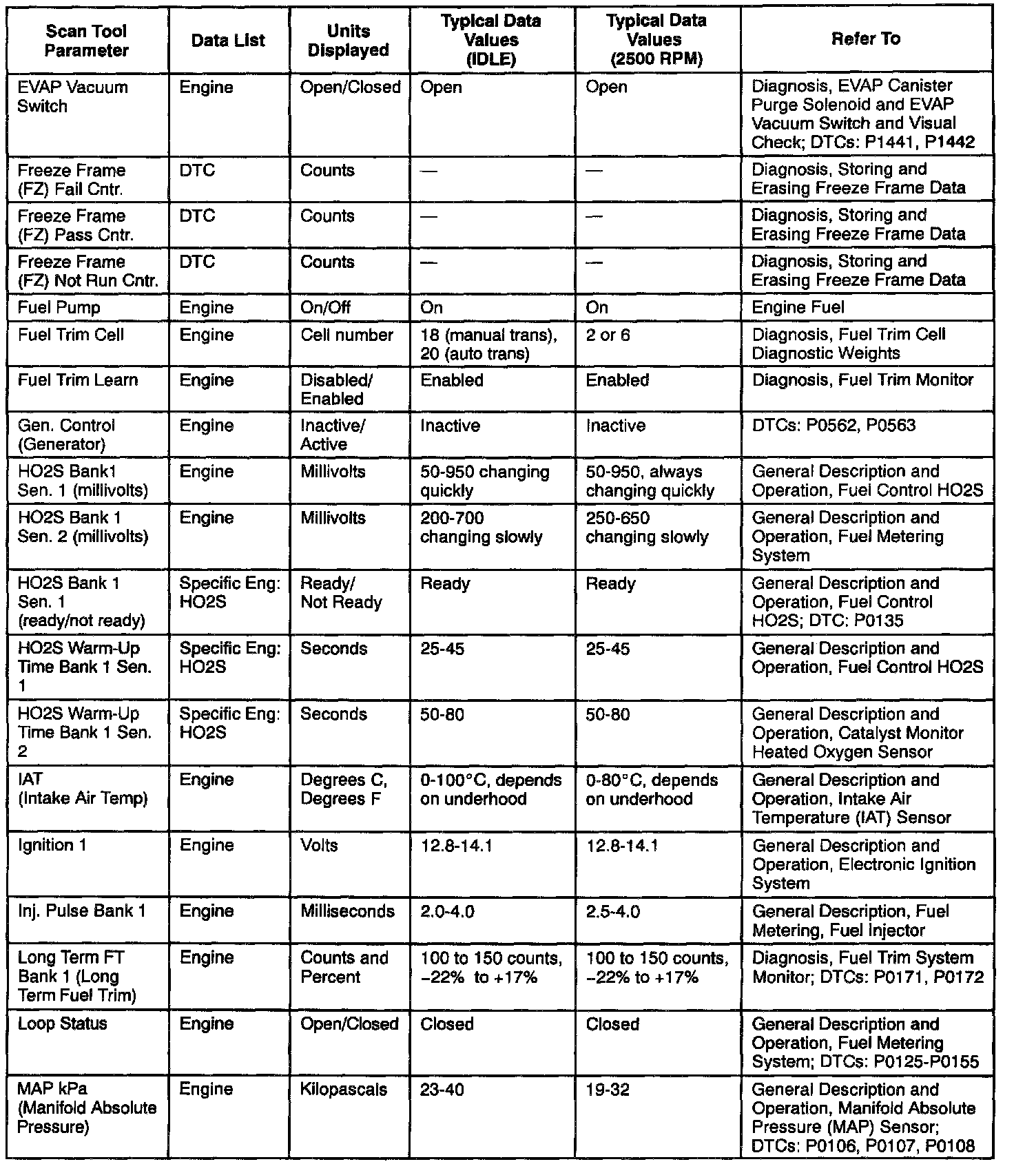 Use the Typical Scan Data Values Table only after the On-Board Diagnostic System Check has been completed, no DTC(s) were noted, and you have determined that the on-board diagnostics are functioning properly. Scan Tool values from a properly-running engine may be used for comparison with the engine you are diagnosing. The typical scan data values represent values that would be seen on a normally-running engine.