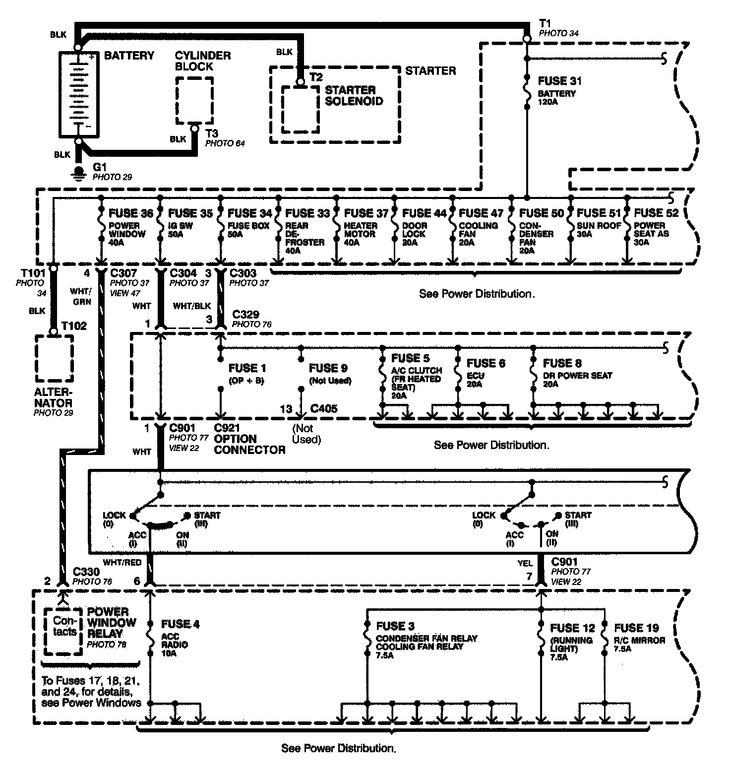 Power Distribution schematics show how power is supplied from the positive battery terminal to various circuits in the car. Refer to Power Distribution to get a more detailed picture of how power is supplied to the circuit you're working on.
