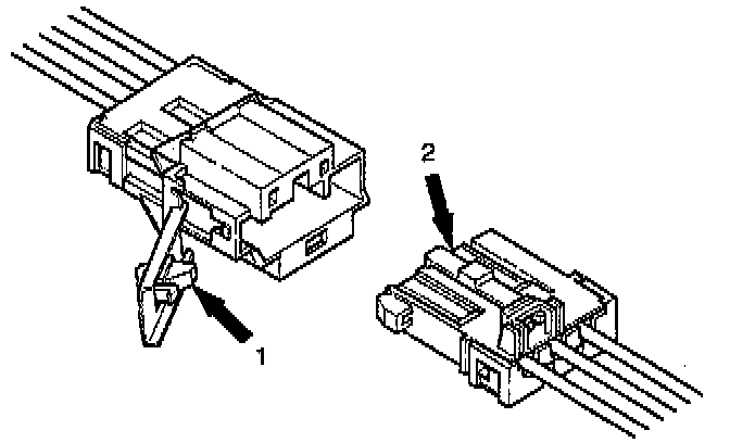 CAUTION: Double-lock type yellow color connectors are used for supplemental restraint system-air bag circuit. When removing the cable harness, disconnect the connector by unlocking at two places, outside (1) and inside (2). In such a case, do not pull the wires. Otherwise, wire disconnection may occur. When connect the double lock type SRS connector, insert the connector completely and lock at outside. Imperfect locking may cause malfunction of SRS circuit.