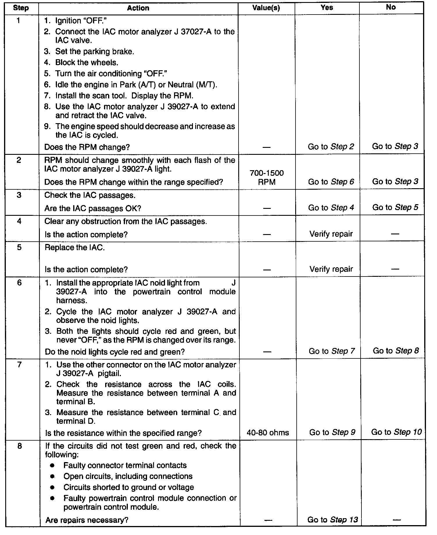 A slow, unstable, or fast idle may be caused by a non-IAC system problem that cannot be overcome by the AC valve. Out of control range IAC scan tool counts will be above 60 if idle is too low, and zero counts if idle is too high. The following checks should be made to repair a non-IAC system problem: