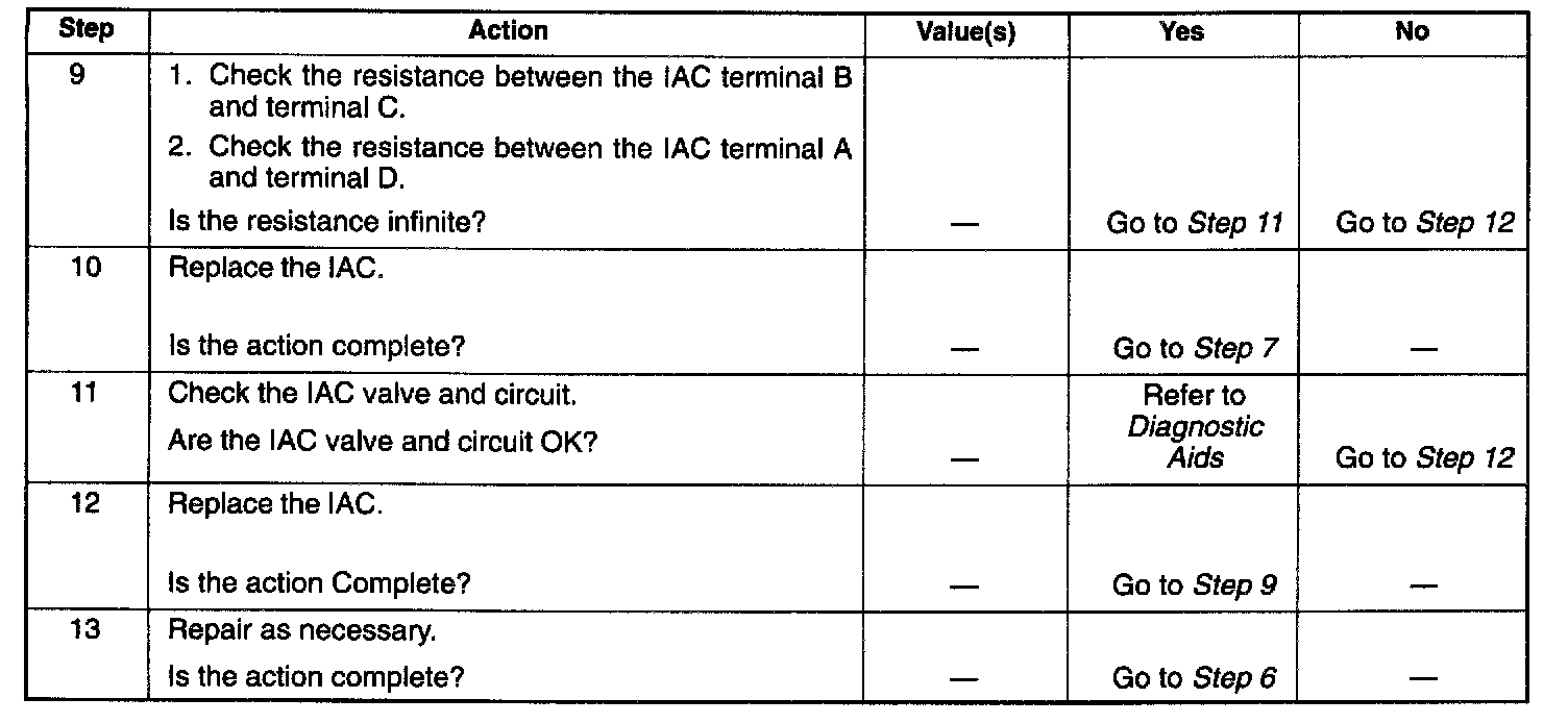 2. This step checks the quality of the IAC movement in step 1. Between 700 revolutions per minute (RPM) and about 1500 RPM, the engine speed should change smoothly with each flash of the tester light in both extend and retract. If the IAC valve is retracted beyond the control range (about 1500 RPM), it may take many flashes to extend the IAC valve before engine speed will begin to drop. This is normal on certain engines. Fully extending the IAC may cause engine stall. This may be normal.