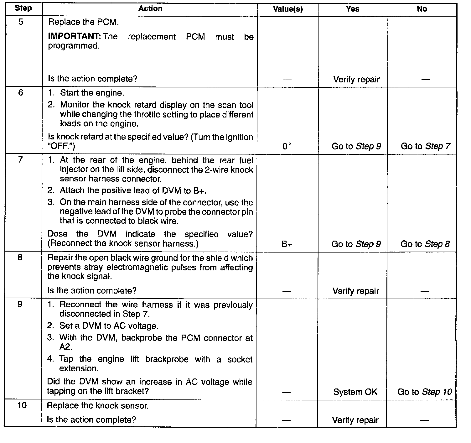 9. The change in signal speed depends on how hard the tapping is done. Normally there is about 1.5 to 10 mV at PCM pin A2 with the engine off. Loud tapping should be able to make the reading jump to 20 - 25 mV AC.