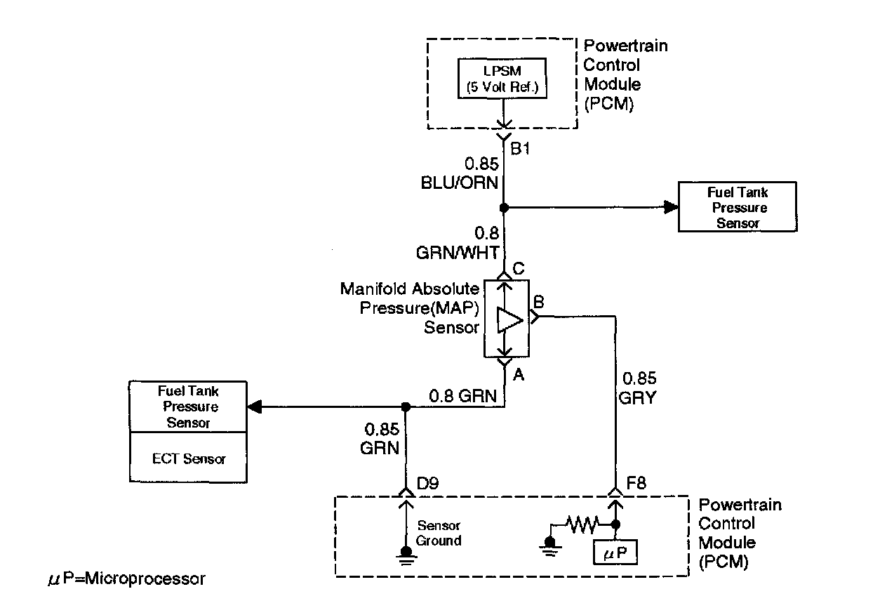 The manifold absolute pressure (MAP) sensor measures the changes in the intake MAP which result from engine load (intake manifold vacuum) and engine speed changes; and converts these into a voltage output. The powertrain control module (PCM) sends a 5 - volt reference voltage to the MAP sensor. As the MAP changes, the output voltage of the sensor also changes. By monitoring the the sensor output voltage, the PCM knows the MAP. A lower pressure (low voltage) output voltage will be about 1 - 2 volts at idle. Higher pressure (high voltage) output voltage will be about 4 - 4.8 volts at wide open throttle. The MAP sensor is also used, under certain conditions, to measure barometric pressure, allowing the PCM to make adjustments for different altitudes. The PCM uses the MAP sensor to diagnose proper operation of the EGR system, in addition to other functions.