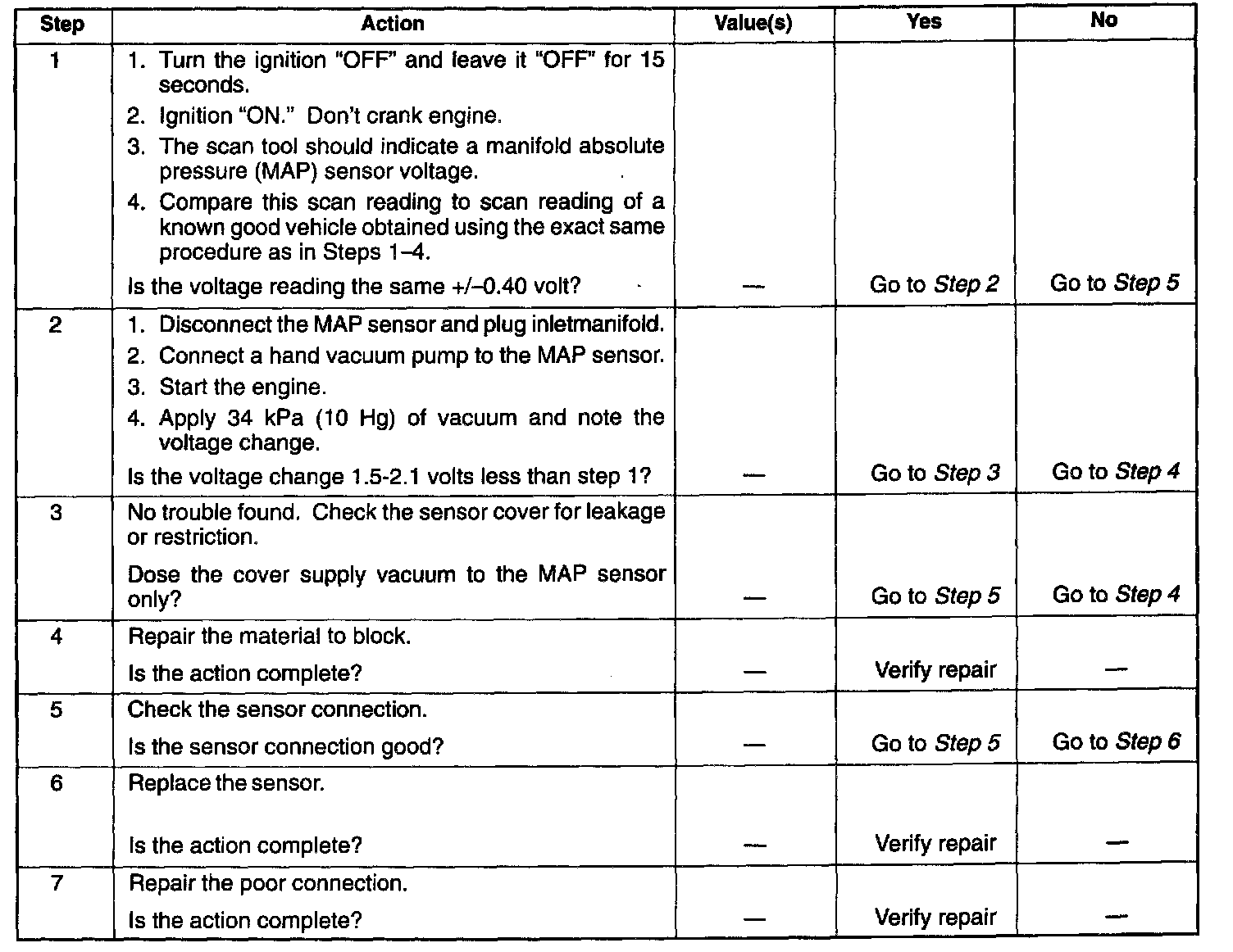 1. Applying 34 kPa (10 Hg) vacuum to the MAP sensor should cause the voltage to be 1.5-2.1 volts less than the voltage at step 1. Upon applying vacuum to the sensor, the change in voltage should be instantaneous. A slow voltage change indicates a faulty sensor.