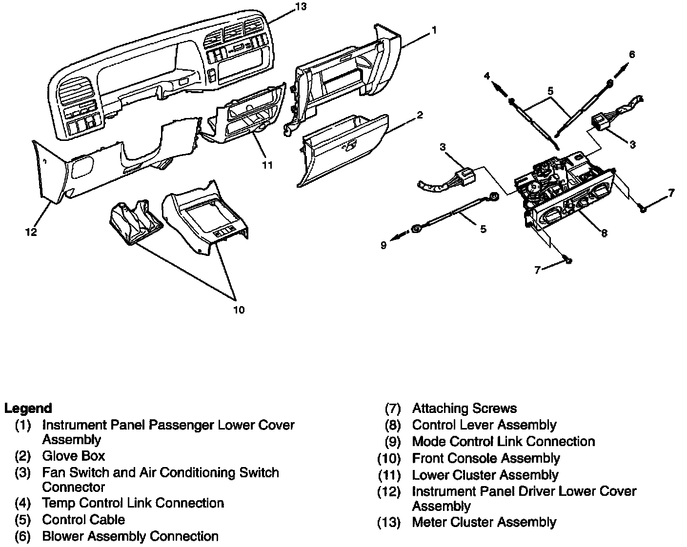 9. Pull the control lever assembly out and disconnect the fan switch and air conditioning switch connectors.