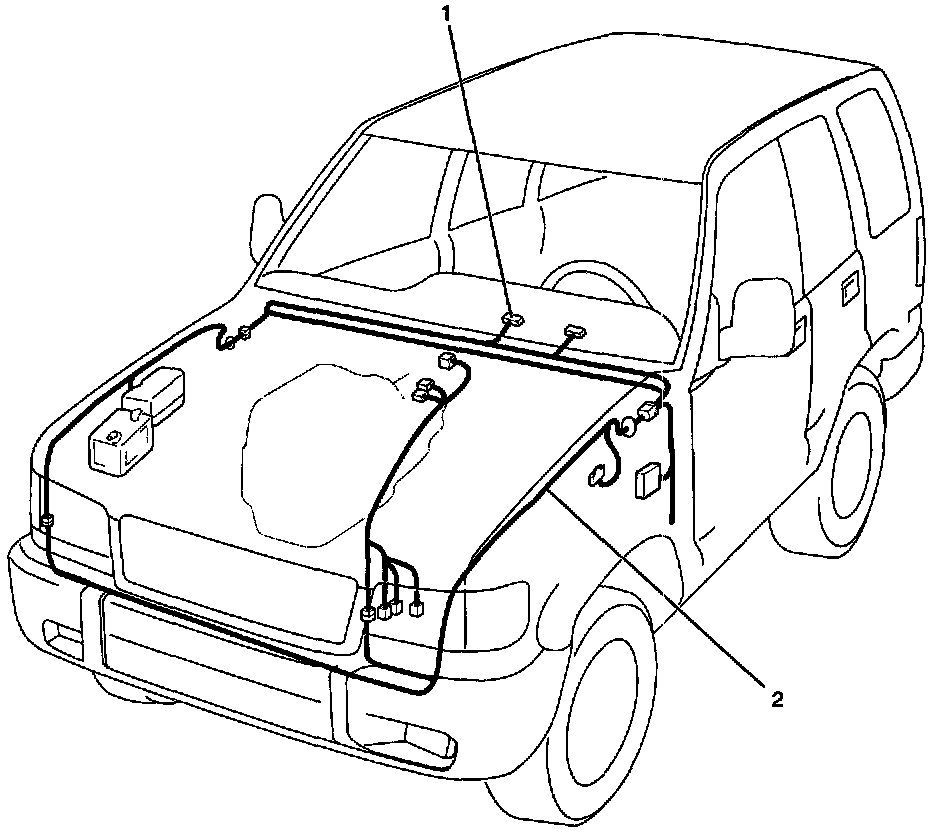 The parts location shows the location of the connectors (1) and the harness (2) used in each harness routing (3).