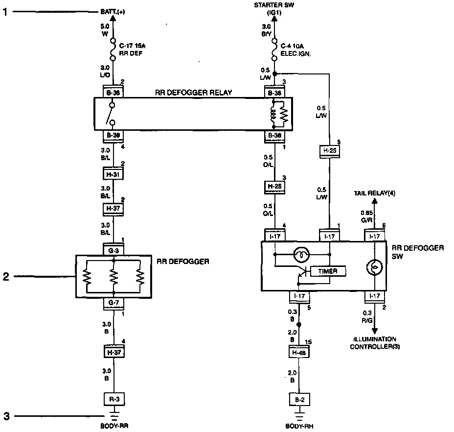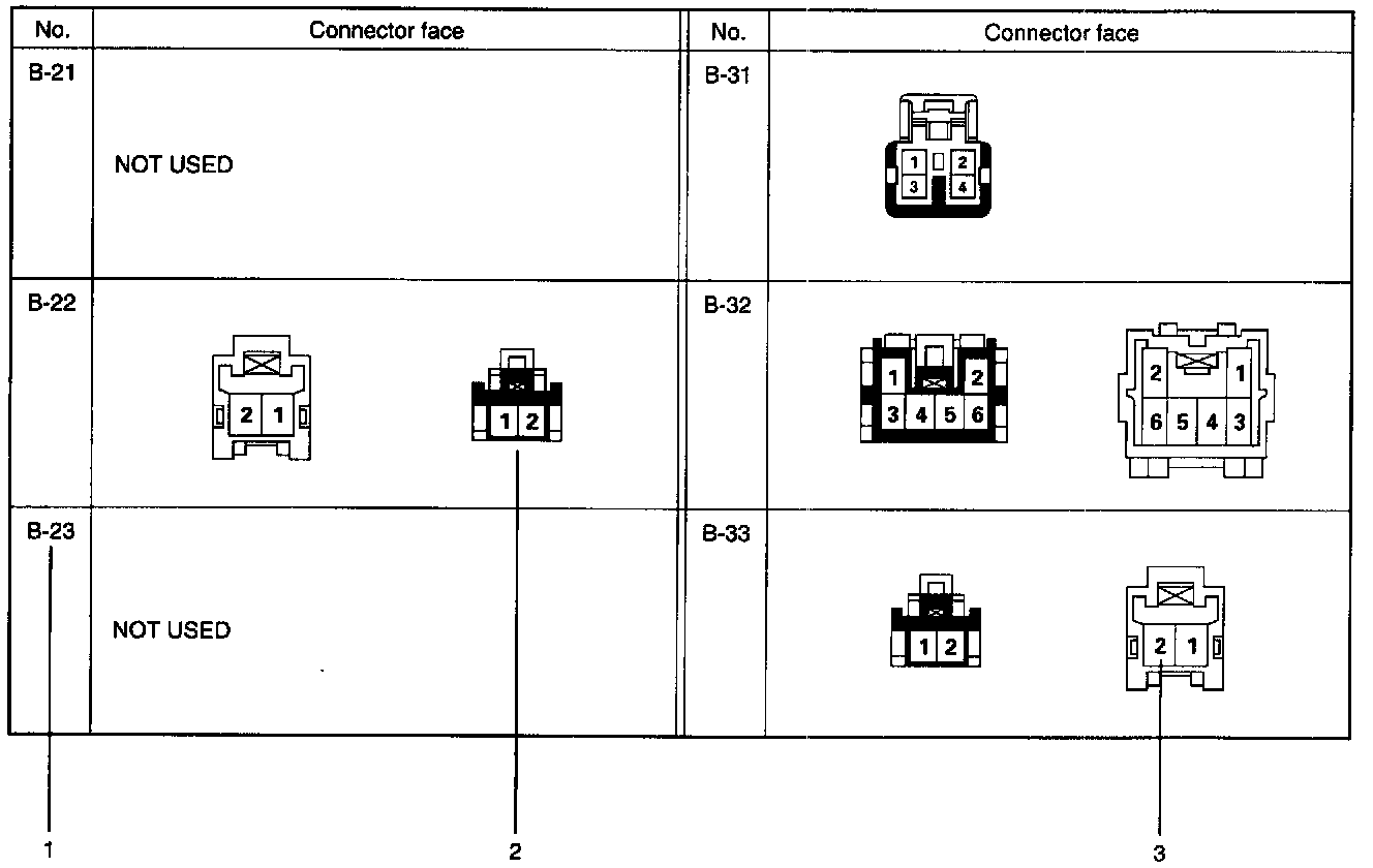 The harness connector faces show each connector's number (1), configuration (2) and the pin number (3).